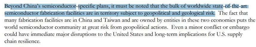 (※ 중국과 대만에 첨단 반도체 생산이 몰려있는건 지정학적으로 큰 리스크이며 이러한 생산시설에 의존하는 미국은 큰 위험에 노출되어 있는 거라는 설명)