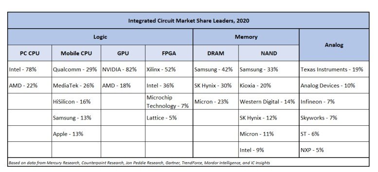 살펴보면 각 분야별 반도체 완제품에 대한 기업 / 국가별 점유율