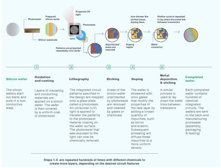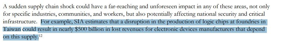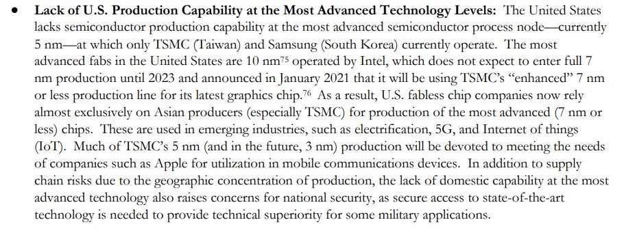 최첨단 기술 수준에서 미국의 생산 능력 부족: 미국은 현재 TSMC(대만)와 삼성(한국)만이 운영 중인 최첨단 반도체 공정 노드(현재 5nm)에서의 반도체 생산 능력이 부족합니다. 미국에서 가장 진보된 팹은 인텔이 운영하는 10nm75이며, 인텔은 2023년까지 완전한 7nm 생산에 진입하지 않을 것으로 예상하고 2021년 1월에 최신 그래픽 칩에 TSMC의 "향상된" 7nm 이하 생산 라인을 사용할 것이라고 발표했습니다. 결과적으로 미국 팹리스 칩 회사는 현재 최첨단(7nm 이하) 칩 생산을 위해 거의 전적으로 아시아 생산업체(특히 TSMC)에 의존하고 있습니다. 이러한 칩은 전기화, 5G, 사물 인터넷(IoT)과 같은 신흥 산업에 사용됩니다. TSMC의 5나노(향후에는 3나노) 생산량의 대부분은 모바일 통신 장치에 활용하기 위한 Apple과 같은 기업의 요구를 충족하는 데 투입될 것입니다. 생산의 지리적 집중으로 인한 공급망 위험 외에도 일부 군사 애플리케이션에 기술적 우위를 제공하기 위해서는 최첨단 기술에 대한 안전한 접근이 필요하기 때문에 최첨단 기술에 대한 국내 역량의 부족은 국가 안보에 대한 우려를 불러일으킵니다.