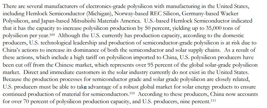 반도체용 폴리실리콘과 태양광용 폴리실리콘의 생산 공정은 밀접한 관련이 있기 때문에 미국 생산업체들은 반도체용 소재의 지속적인 생산을 보장하기 위해 태양광 에너지 제품의 견고한 글로벌 시장을 활용할 수 있어야 합니다.