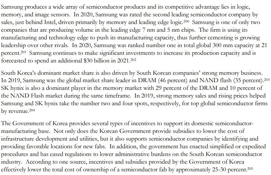 이 보고서의 중국에 대한 광적인 서술에 비하면 한국 반도체 산업에 대한 미국의 시각은 사실 전무하다시피함. 약간 무관심에 가까운 느낌도 드는데 간략히 설명하면 그냥 반도체 생산 분야에서 대만과 함께 미국을 앞서있는데 구체적으로는 메모리에서 가장 잘하고 파운드리는 대만에 뒤쳐지고 소부장은 전체적으로 못하고 첨단 패키징은 어느정도 하고 이정도 수준으로 서술해놓음.
