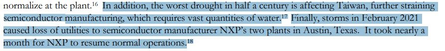 또한 반세기 만에 최악의 가뭄이 대만에 영향을 미치고 있어 막대한 양의 물을 필요로 하는 반도체 제조에 더욱 큰 부담을 주고 있습니다. 마지막으로 2021년 2월에는 폭풍으로 인해 텍사스 오스틴에 있는 반도체 제조업체 NXP의 두 공장에 유틸리티가 끊겼습니다. NXP가 정상 가동을 재개하는 데 거의 한 달이 걸렸습니다.