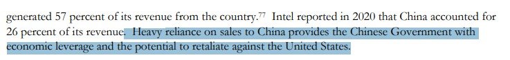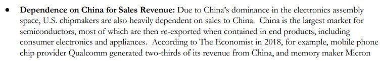판매 수익의 중국 의존도: 전자제품 조립 분야에서 중국이 우위를 점하고 있기 때문에 미국 칩 제조업체의 중국 판매 의존도도 높습니다. 중국은 반도체 최대 시장이며, 생산된 반도체는 대부분 가전제품 및 가전제품을 포함한 최종 제품에 포함되어 재수출됩니다. 예를 들어, 2018년 이코노미스트에 따르면 휴대폰 칩 공급업체인 퀄컴은 전체 매출의 3분의 2를 중국에서 창출했으며, 메모리 제조업체인 마이크론은 전체 매출의 57%를 중국에서 발생시켰습니다. 인텔은 2020년에 중국이 전체 매출의 26%를 차지한다고 보고했습니다. 중국에 대한 매출 의존도가 높다는 것은 중국 정부에 경제적 영향력과 미국에 대한 보복 가능성을 제공합니다.