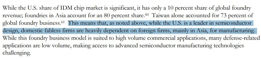 IDM 칩 시장에서 미국의 점유율은 상당하지만, 전 세계 파운드리 매출에서 차지하는 비중은 10%에 불과하며 아시아 파운드리가 80%의 점유율을 차지하고 있습니다. 대만 단독으로 글로벌 파운드리 산업에서 73%의 비중을 차지합니다. 이는 위에서 언급한 바와 같이 미국이 반도체 설계의 선두주자인 반면, 국내 (미국) 팹리스 기업은 제조를 위해 주로 아시아를 중심으로 한 해외 기업에 크게 의존하고 있다는 것을 의미합니다. 이러한 파운드리 비즈니스 모델은 대량 상업용 애플리케이션에는 적합하지만, 국방 관련 애플리케이션은 소량 생산이 많아 첨단 반도체 제조 기술에 대한 접근이 어렵습니다.