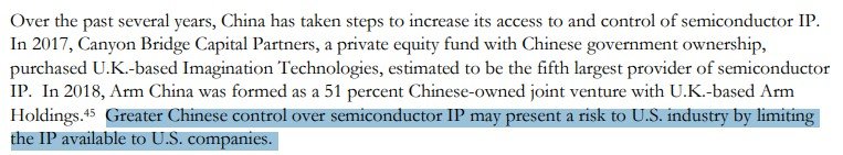 지난 몇 년 동안 중국은 반도체 IP에 대한 접근성과 통제력을 높이기 위한 조치를 취해 왔습니다. 2017년에는 중국 정부가 소유한 사모펀드인 Canyon Bridge Capital Partners가 5번째로 큰 반도체 IP 공급업체로 추정되는 영국 기반의 Imagination Technologies를 인수했습니다. 2018년에는 영국에 본사를 둔 Arm 홀딩스와 중국인이 51% 지분을 소유한 합작회사 Arm China가 설립되었습니다. 반도체 IP에 대한 중국의 통제력이 강화되면 미국 기업이 사용할 수 있는 IP가 제한되어 미국 산업에 위험을 초래할 수 있습니다