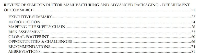 보고서의 내용은 반도체 생태계 전체를 조망하면서 각 국가가 반도체의 어떤 분야에서 얼마만큼 차지하고 있는지, 그리고 거기에서 미국의 잠재적 위험요소가 무엇이고 어떻게 개선해야 미국의 국익에 적절 할 지를 다루고 있음