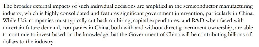 이러한 개별 결정의 광범위한 외부 영향은 고도로 통합되어 있고 특히 중국에서 정부의 개입이 큰 반도체 제조 산업에서 증폭됩니다. 미국 기업들은 불확실한 미래 수요에 직면하면 일반적으로 고용, 자본 지출, R&D를 줄여야 하는 반면, 중국 기업들은 정부가 직접 소유하고 있든 그렇지 않든 중국 정부가 산업에 수십억 달러를 지원할 것이라는 사실을 바탕으로 투자를 지속할 수 있습니다.
