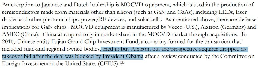 일본과 네덜란드의 리더십에서 예외적인 것은 LED, 레이저 다이오드 및 기타 광 칩, 전력/RF 장치, 태양 전지 등 실리콘 이외의 재료(예: GaN 및 GaAs)로 만든 반도체를 생산하는 데 사용되는 MOCVD 장비입니다. 위에서 언급했듯이 GaN 칩에는 국방적 의미가 있습니다. MOCVD 장비는 Veeco(미국), Aixtron(독일), AMEC(중국)에서 제조합니다. 중국은 인수를 통해 MOCVD 시장에서 시장 점유율을 확보하려고 시도했습니다. 2016년에는 중국 국영 및 지방 소유 기관이 참여한 거래를 위해 설립된 중국 기업 푸젠 그랜드 칩 투자 펀드(Fujian Grand Chip Investment Fund)가 에이스트론 인수를 시도했지만, 인수 예정자가 인수 제안을 철회했습니다.
