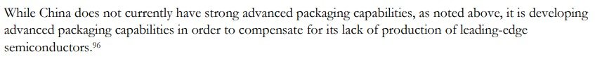 중국은 현재 강력한 첨단 패키징 역량을 보유하고 있지는 않지만, 위에서 언급한 바와 같이 첨단 반도체 생산 부족을 보완하기 위해 첨단 패키징 역량을 개발하고 있습니다.