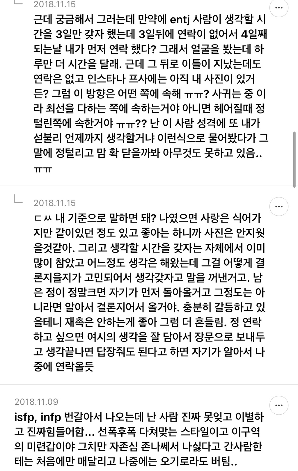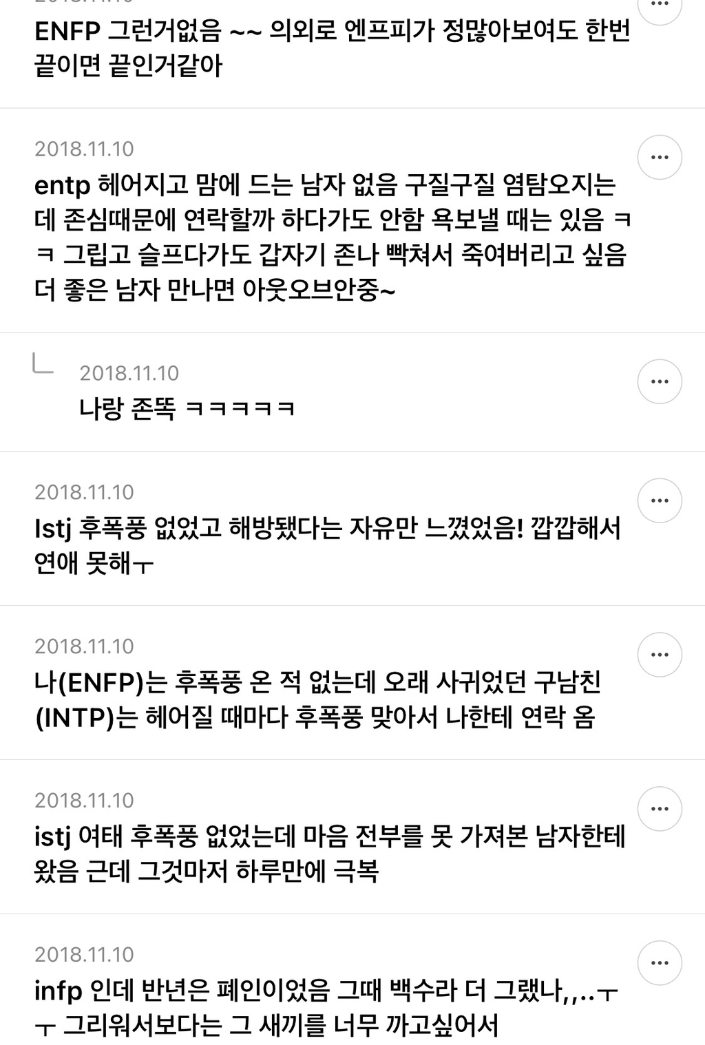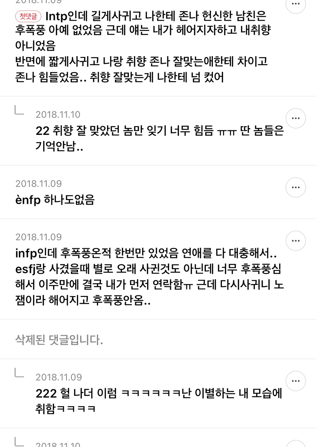 작성자니멘탈내멘탈헤비메탈 작성시간 24.04.06 infp 항상 나는 상대방에게 최선을 다했고 모든 맘을 다했기때문에 헤어지고나서 미련없음 후폭풍 한번도 느껴본적없슴