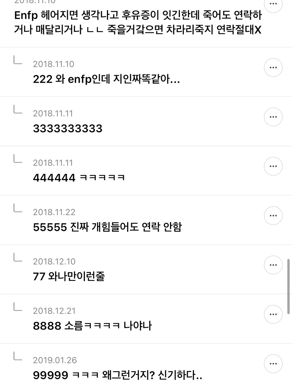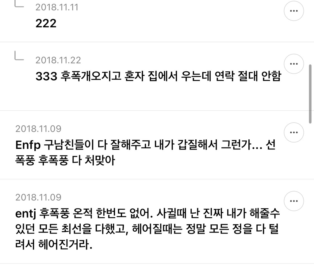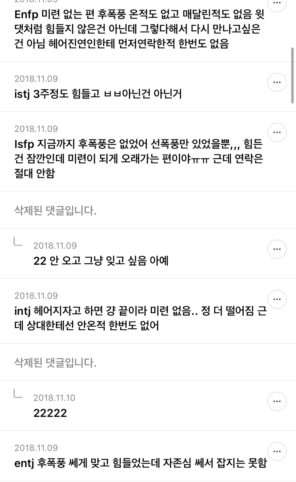 작성자니멘탈내멘탈헤비메탈 작성시간 24.04.06 infp 항상 나는 상대방에게 최선을 다했고 모든 맘을 다했기때문에 헤어지고나서 미련없음 후폭풍 한번도 느껴본적없슴