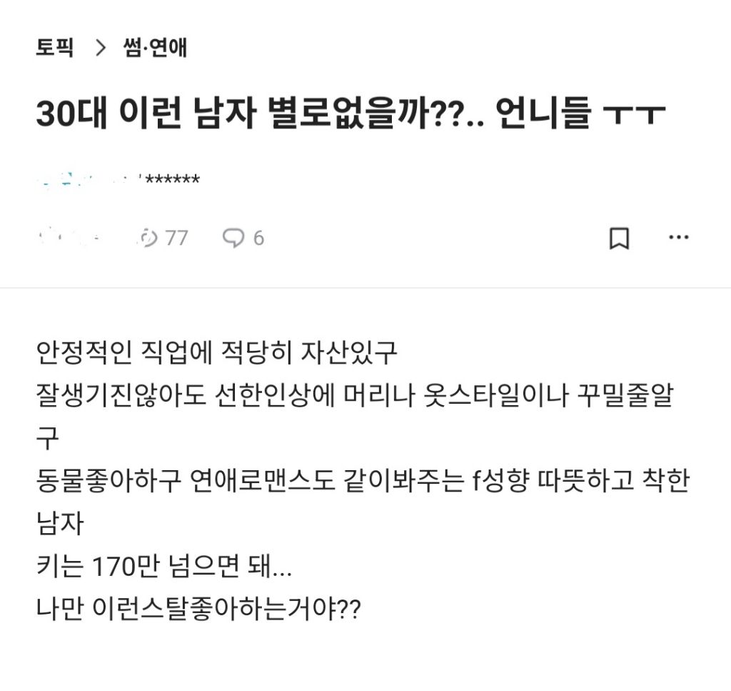 작성자다음사람을위해남친잔액을남겨주세요 작성시간 24.04.08 이렇게 얘기해도 소개받으면 키만 170이고 하나도 해당안되는 븅신이 나오지ㅋㅋㅋㅋㅋ