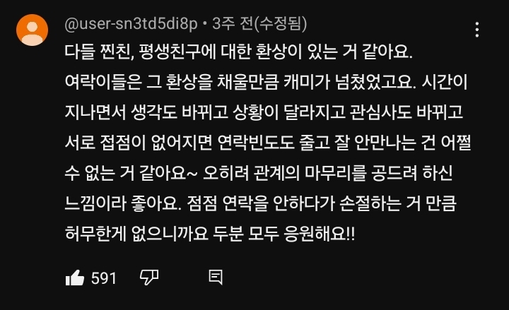 작성자뉴로로롱 작성시간 24.04.10 친구도 나이 먹으면서 각자 취향 가치관 달라지면서 멀어지는데 뭐 충분히 그럴수있고 자연스럽다고 느껴져ㅋㅋㅋㅋㅋㅋ