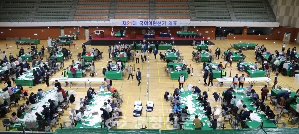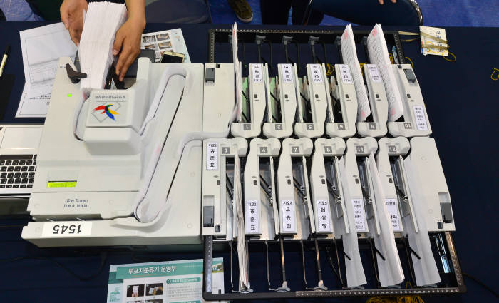 사람들이 일일이 손으로 분류한 표는 바로 옆에 있는 전자개표기(투표지분류기) 테이블로 간다.