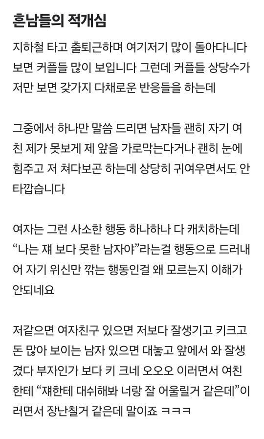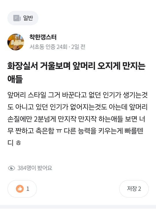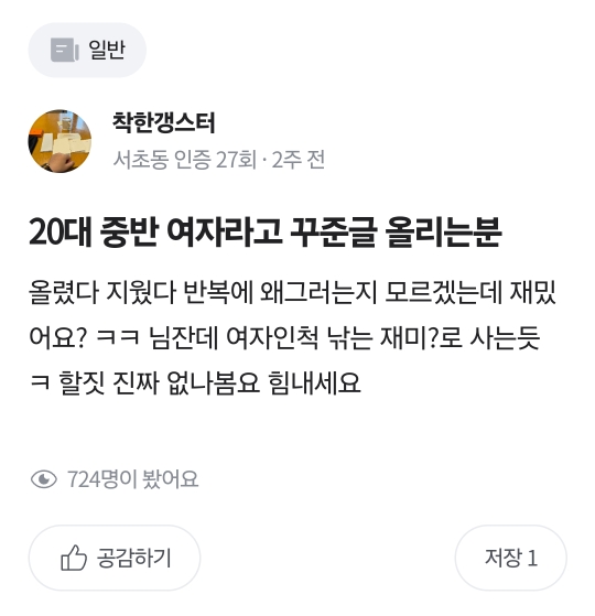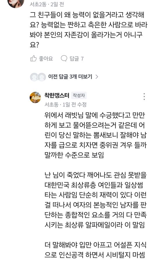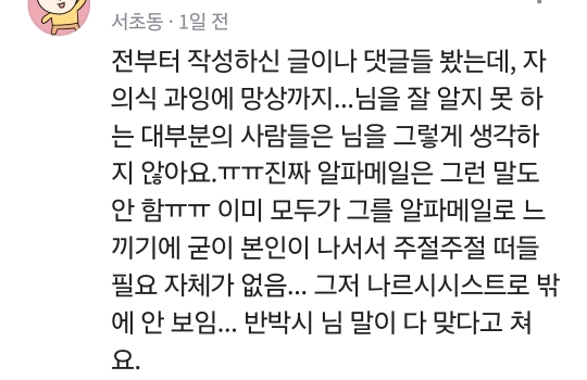 [흥미돋]당근에 나타난 자칭 알파메일 등장 작성자장미꽃두고갑니다|작성시간24.04.11|조회수12,101 목록 댓글 26 글자크기 작게가 글자크기 크게가 출처: 여성시대 (장미꽃두고갑니다)앞머리 만지는게 측은하다는 글이 올라왔다댓글을 보자음...과거의 글들을 보자 자칭 알파메일의 최후..^^ 다음검색 현재 게시글 추가 기능 열기 북마크 공유하기 신고 센터로 신고 댓글 댓글 26 댓글쓰기 답글쓰기 댓글 리스트 작성자No Eagle | 작성시간 24.04.12 아 존나 웃겨 어느 알파메일이 지하철로 출퇴근하고 중고거래앱을 들락날락하다 키배까지 뜨고 정지먹어ㅋㅋㅋㅋㅋ 작성자애증의사회학 | 작성시간 24.04.12 자적자 재밌네 지네들끼리 자주 싸웠으면… 작성자둔따라라란 | 작성시간 24.04.12 진짜 개병신같다.. 작성자노트요정 | 작성시간 24.04.12 자적자는 과학이다 작성자응 어쩔티비 | 작성시간 24.08.21 ㅋㅋ 댓글 전체보기