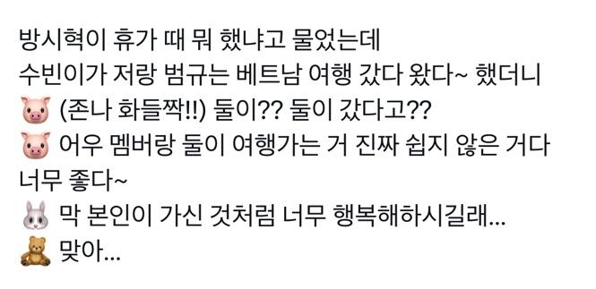 어재 시혁님이랑 식사했는데 단짝즈 둘이서 휴가 때 여행 다녀왔다는 거 듣고 본인 이야기처럼 좋아하셨대 pic.twitter.com/g03eUNsoBM