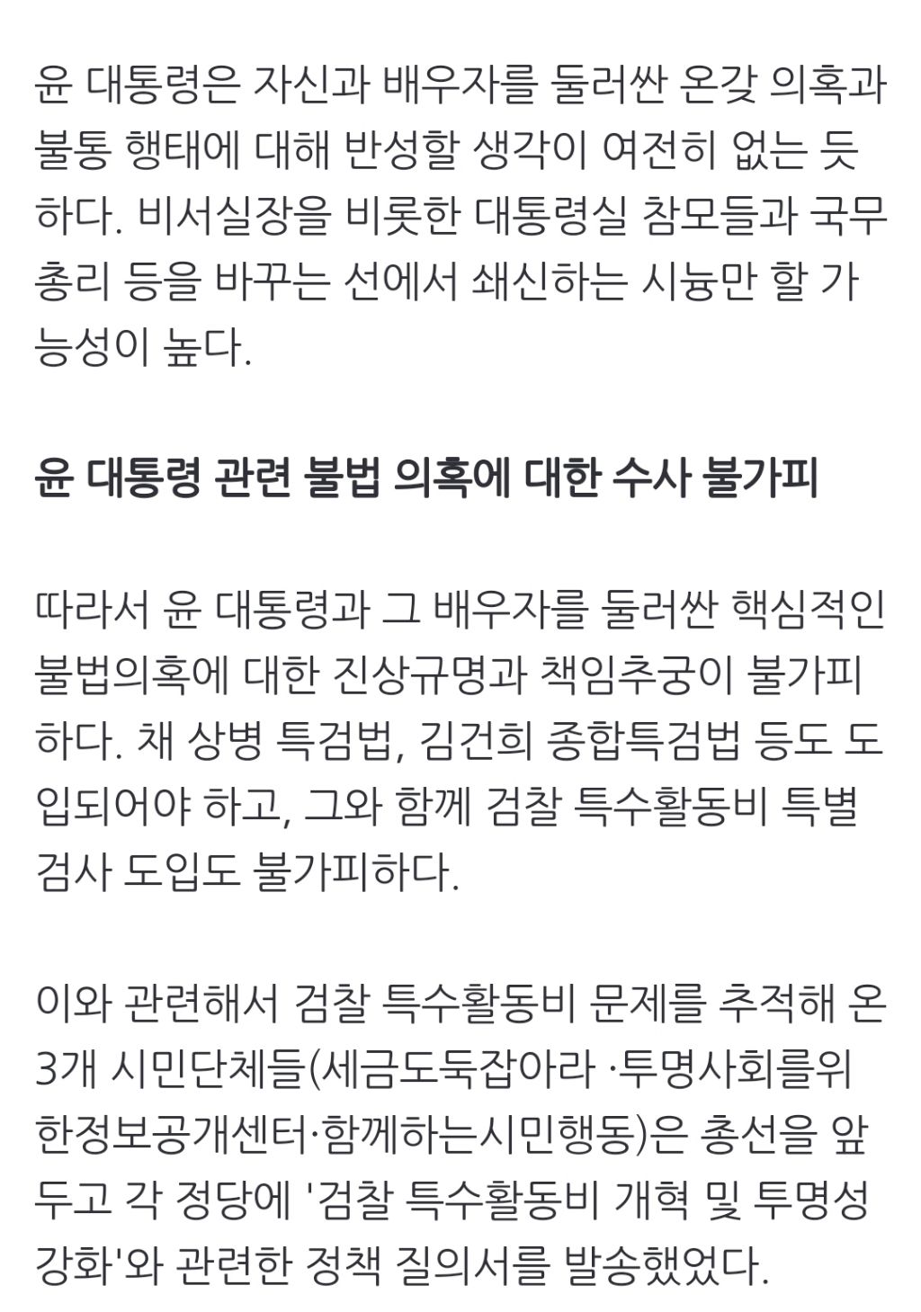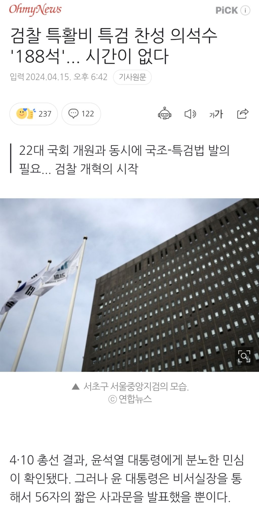 [여시뉴스데스크]검찰 특활비 특검 찬성 의석수 '188석'... 시간이 없다 작성자천리길|작성시간24.04.15|조회수1,207 목록 댓글 9 글자크기 작게가 글자크기 크게가 출처: https://naver.me/FynCzIWm검찰 특활비 특검 찬성 의석수 '188석'... 시간이 없다▲ 서초구 서울중앙지검의 모습. ⓒ 연합뉴스 4·10 총선 결과, 윤석열 대통령에게 분노한 민심이 확인됐다. 그러나 윤 대통령은 비서실장을 통해서 56자의 짧은 사과문을 발표했을 뿐이다. 윤 대n.news.naver.com이하 생략전문 출처로 다음검색 현재 게시글 추가 기능 열기 북마크 공유하기 신고 센터로 신고 댓글 댓글 9 댓글쓰기 답글쓰기 댓글 리스트 작성자고습도치의 습곀 | 작성시간 24.04.15 꺄 작성자주4일제근무 | 작성시간 24.04.15 아싸 작성자cheeeese | 작성시간 24.04.15 나 진짜 잘 몰라서 그러는데 검찰이 특활비를 몇백억씩 편성받아서 쓸 이유가 뭔지 궁금해... 작성자그린애플 펄 스무디 | 작성시간 24.04.15 작성자삼겹샇 | 작성시간 24.04.16 가보자고~ 댓글 전체보기