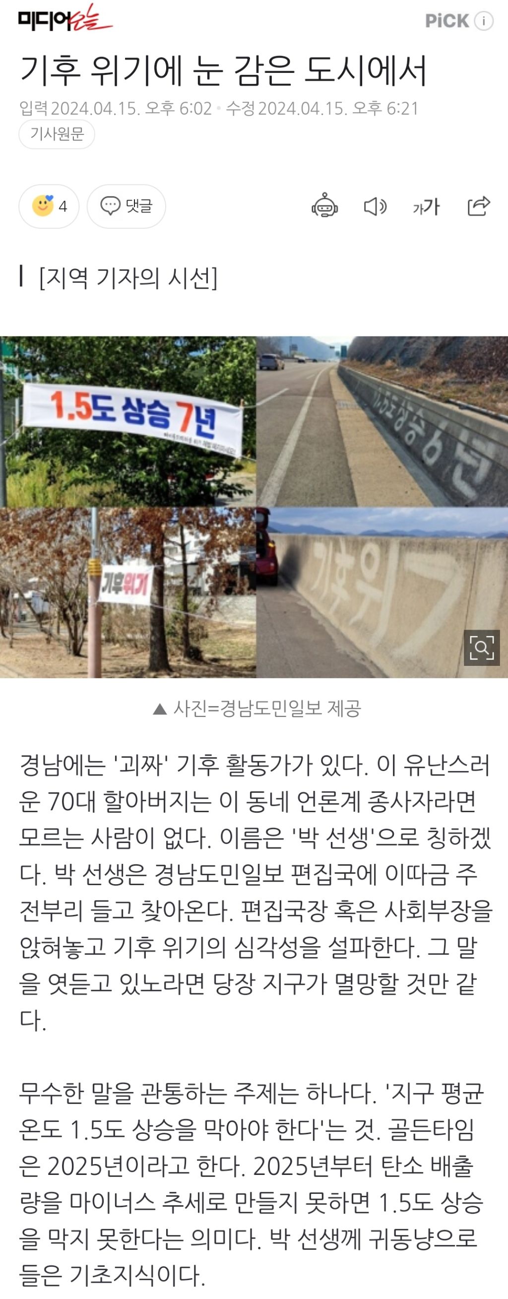 [여시뉴스데스크]기후 위기에 눈 감은 도시에서 작성자천리길|작성시간24.04.15|조회수2,017 목록 댓글 1 글자크기 작게가 글자크기 크게가 출처: https://naver.me/Fm2uS13t기후 위기에 눈 감은 도시에서경남에는 '괴짜' 기후 활동가가 있다. 이 유난스러운 70대 할아버지는 이 동네 언론계 종사자라면 모르는 사람이 없다. 이름은 '박 선생'으로 칭하겠다. 박 선생은 경남도민일보 편집국에 이따금 n.news.naver.com중략이하 생략전문 출처로 다음검색 현재 게시글 추가 기능 열기 북마크 공유하기 신고 센터로 신고 댓글 댓글 1 댓글쓰기 답글쓰기 댓글 리스트 작성자서단달다구리 | 작성시간 24.04.15 기후위기 한번에 멸망하눈거 아니라구 ㅠㅠ 우리 좀 힘내요 댓글 전체보기