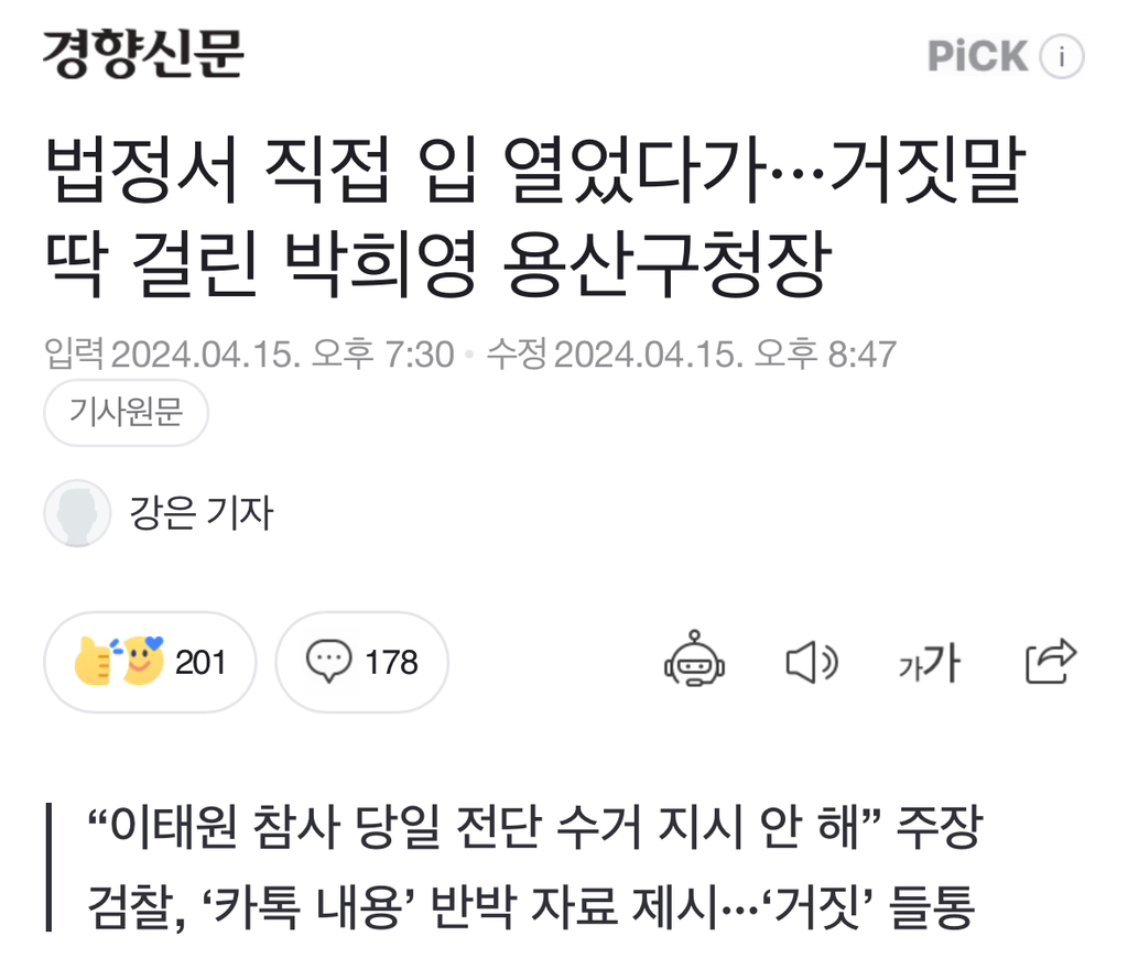 [여시뉴스데스크]법정서 직접 입 열었다가···거짓말 딱 걸린 박희영 용산구청장 작성자소리앙|작성시간24.04.15|조회수1,281 목록 댓글 2 글자크기 작게가 글자크기 크게가 출처: https://naver.me/FgS7YwTR법정서 직접 입 열었다가···거짓말 딱 걸린 박희영 용산구청장이태원 참사 책임으로 기소된 박희영 서울 용산구청장이 재판에서 참사 당일 구청 공무원에게 ‘대통령 비판 전단 수거’ 지시를 해 사고를 키웠다는 공소사실을 직접 부인했다가 증거로 반박n.news.naver.com전문출처 다음검색 현재 게시글 추가 기능 열기 북마크 공유하기 신고 센터로 신고 댓글 댓글 2 댓글쓰기 답글쓰기 댓글 리스트 작성자블투마우스 | 작성시간 24.04.15 공무원을 정권의 발닦개로 사용해서 국민의 생명이 위협당한 건데 작성자삼겹샇 | 작성시간 24.04.16 진짜 용산구 국회의원부터 싹다 탈탈 털어라 댓글 전체보기