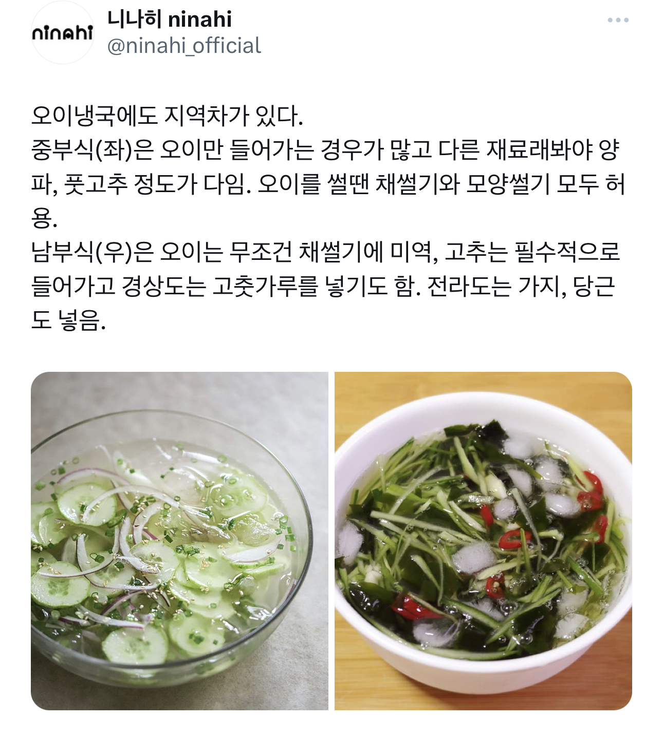[스크랩] [흥미돋]오이냉국에도 지역차가 있다. 작성자아아의 계절|작성시간24.04.15|조회수14,957 목록 댓글 66 글자크기 작게가 글자크기 크게가 출처 : https://twitter.com/ninahi_official/status/1678648726724771840?s=46&t=v7QMmEln8v7WsADFKYn65g여성시대 X file 다음검색 스크랩 원문 : *여성시대* 차분한 20대들의 알흠다운 공간 현재 게시글 추가 기능 열기 북마크 공유하기 신고 센터로 신고 댓글 댓글 66 댓글쓰기 답글쓰기 댓글 리스트 작성자hm_son | 작성시간 24.04.16 미역넣지마~~ 오이랑 고추만 허용 작성자어쩔비브라늄 | 작성시간 24.04.16 미역이 있으면 미역냉국이쥬... 작성자개미는 뚠뚠 오늘도 뚠뚠 열심히 일 | 작성시간 24.04.16 우리집은 왼쪽인데 빨간색이야 작성자과배기를꽈배기로바꽈 | 작성시간 24.04.16 오른쪽개존맛이야🥹😍😍 후루룩 작성자게득리에게세후가십 | 작성시간 24.04.16 오른쪽이 근본 댓글 전체보기