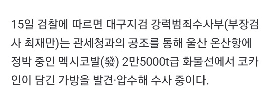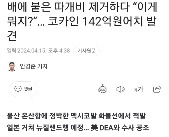 [여시뉴스데스크]배에 붙은 따개비 제거하다 “이게 뭐지?”… 코카인 142억원어치 발견 작성자!즐거운나의집!|작성시간24.04.15|조회수10,768 목록 댓글 10 글자크기 작게가 글자크기 크게가 출처: 여성시대 !즐거운나의집!https://naver.me/GLSq09lk배에 붙은 따개비 제거하다 “이게 뭐지?”… 코카인 142억원어치 발견울산 온산항에 정박한 멕시코발 화물선에서 적발 일본 거쳐 뉴질랜드행 예정… 美 DEA와 수사 공조 화물선 씨체스트(배의 균형을 잡거나 냉각수 용도 해수가 유입되는 통로·Sea Chest)를 청소하던 n.news.naver.com......전문 출처 다음검색 현재 게시글 추가 기능 열기 북마크 공유하기 신고 센터로 신고 댓글 댓글 10 댓글쓰기 답글쓰기 댓글 리스트 답댓글 작성자춘식고구마튀 | 작성시간 24.04.15 아 미쳐 ㅋㅋ 답댓글 작성자오경블 | 작성시간 24.04.15 ㅁㅊㅋㅋㅋㅋㅋㅋㅋㅋㅋㅋㅋㅋㅋㅋㅋㅋㅋ 답댓글 작성자왕눈하세요 | 작성시간 24.04.16 미쳤낰ㅋㅋㅋㅋㅋㅋㅋㅋㅋㅋㅋㅋㅋ 작성자챠지연 | 작성시간 24.04.15 나 저번에 걸린거 스크랩인줄 알았는데 또 걸림????? 작성자기아우승가보자고 | 작성시간 24.04.16 미친....... 댓글 전체보기