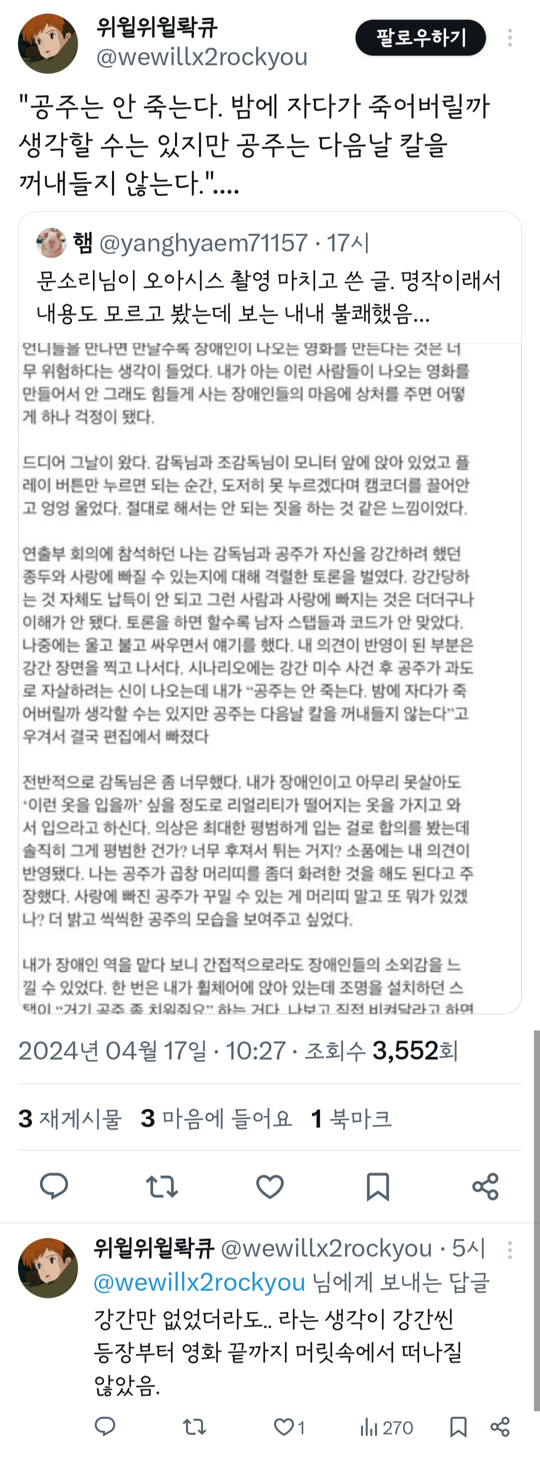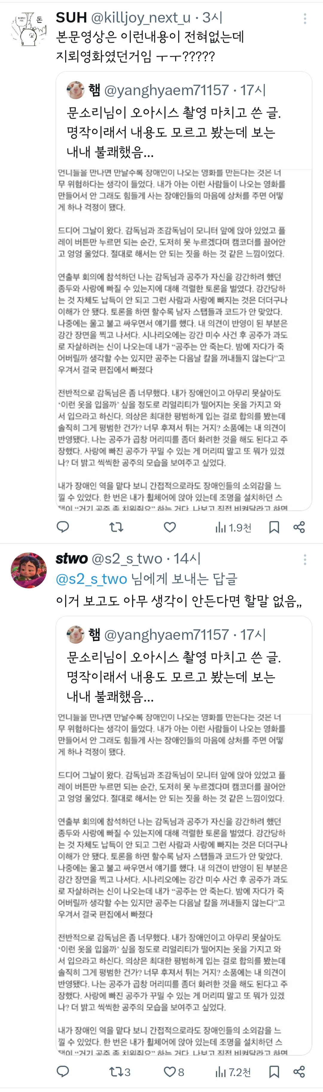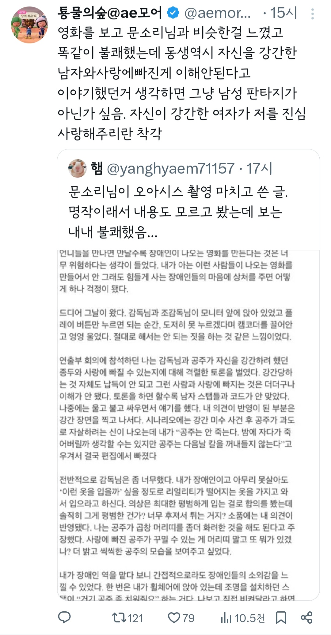 작성자반짝여보석이 작성시간 24.04.17 공감해. 이건 일본야동에 익숙해진 남자들 사고지, 어느 보편적인 여자가 강간남과 연애가 가능하겠어. 옛날에야 죽음외엔 대안이 없으니 그냥 결혼하고 살았지. 아~~ 여주가 죽음을 선택할수 없으니 강간범과 공존을 택한 그런 내용인거야? 그렇다면 더 그렇게 찍었으면 안돼지.... 불쾌하고 읭?했던 부분이야.