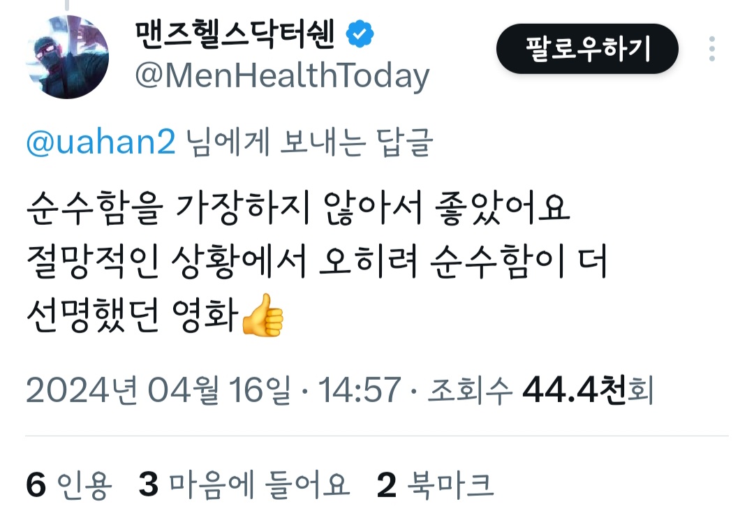 작성자주4일제근무 작성시간 24.04.17 나도 뭘모르고 봤을때도 저 ㄱㄱ장면 때문에 납득이 안되더라고 도대체 왜? 라는 의문만 듦