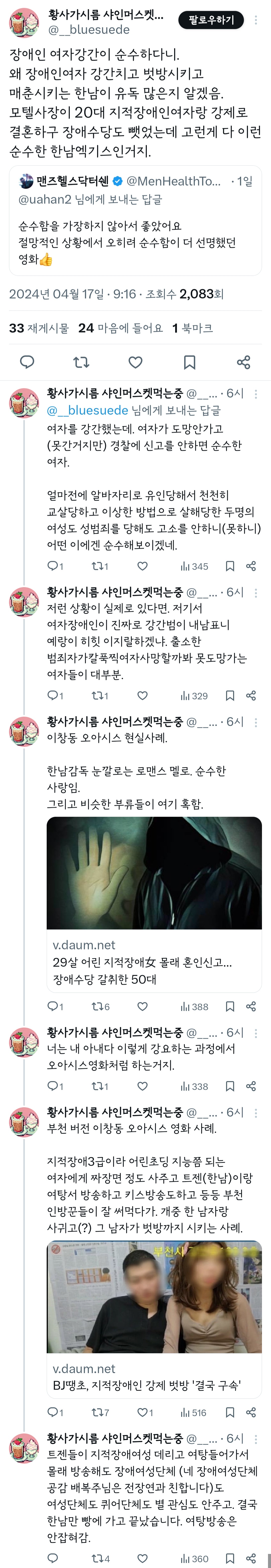 작성자코젤다크라거 작성시간 24.04.18 한국남들 진심 자신의 사랑으로 성녀가 되어가는 창녀 이미지 너무 좋아해 미친놈들