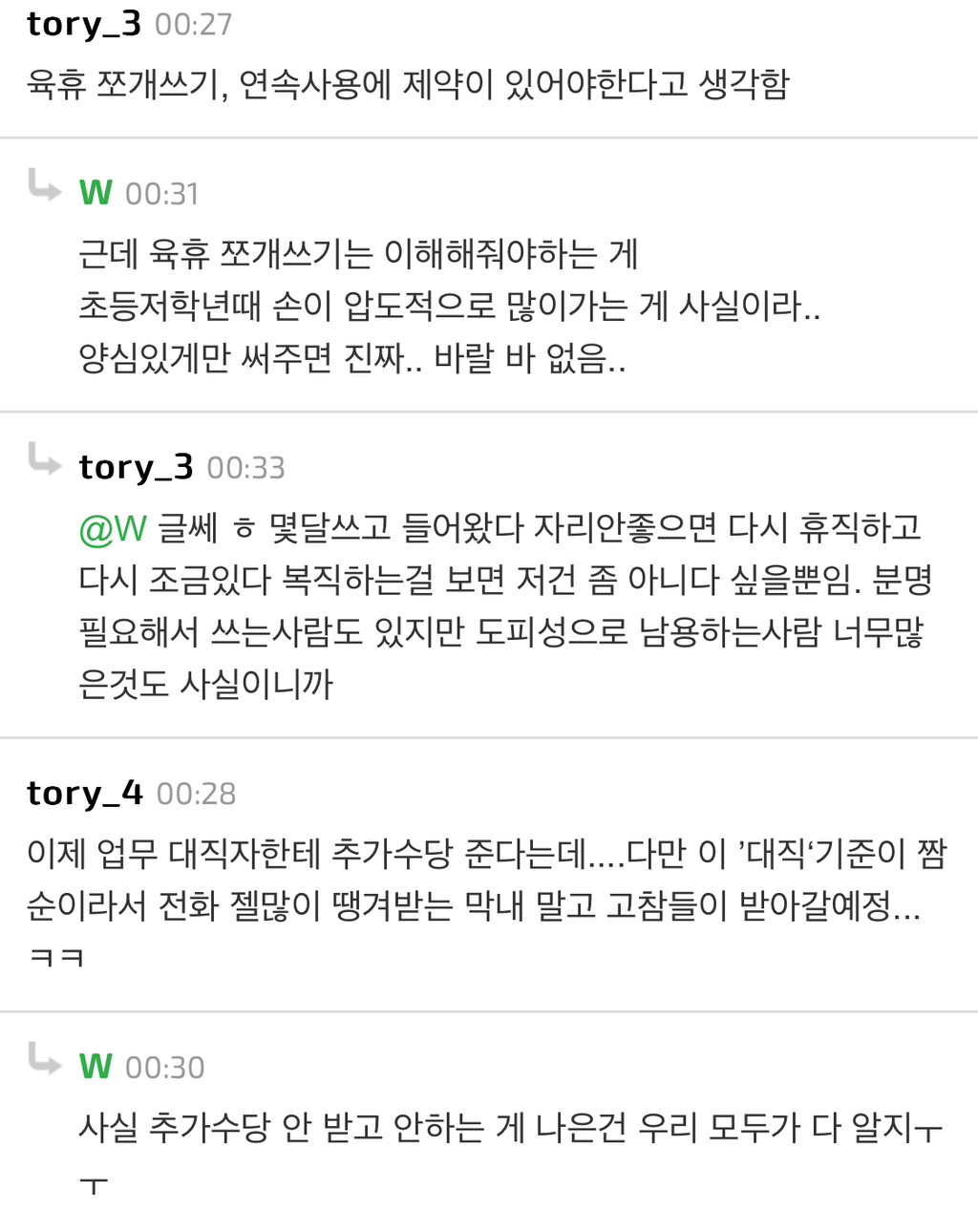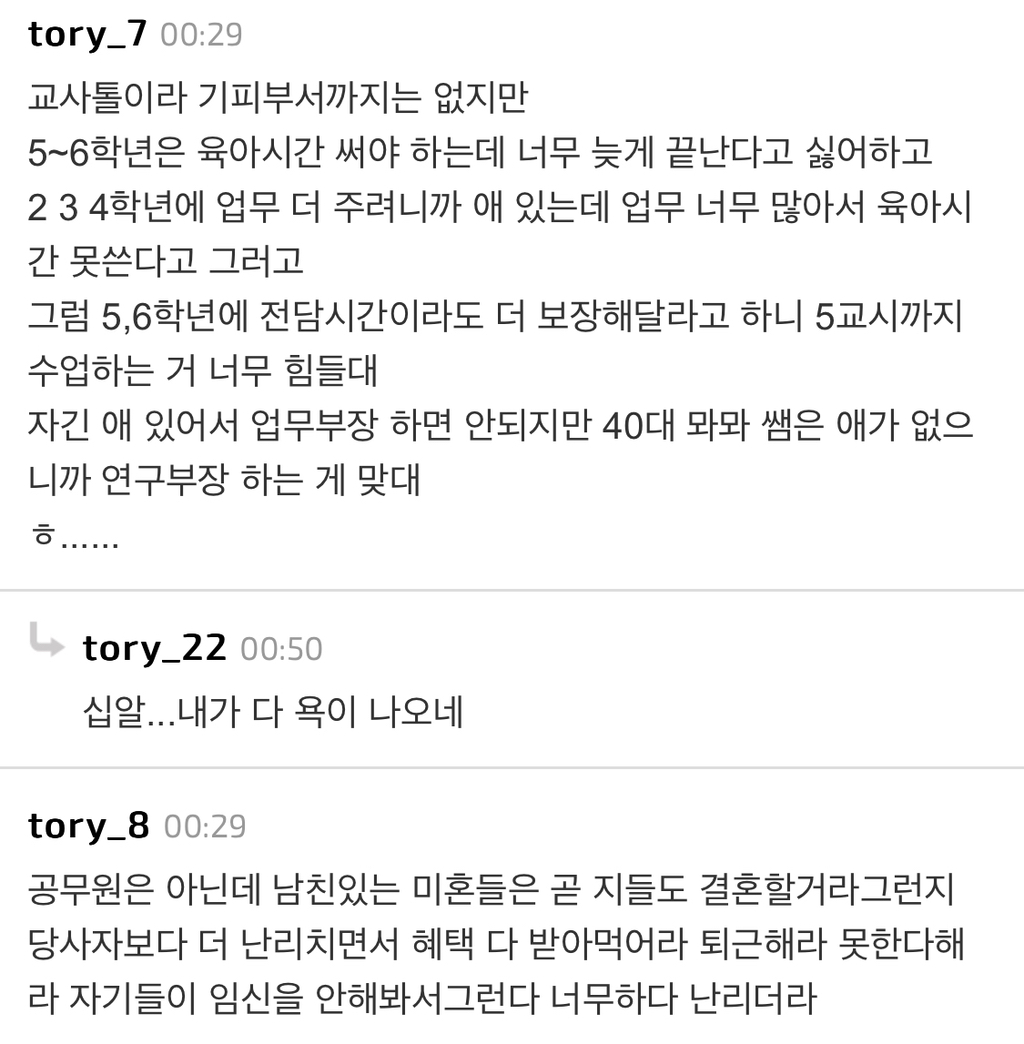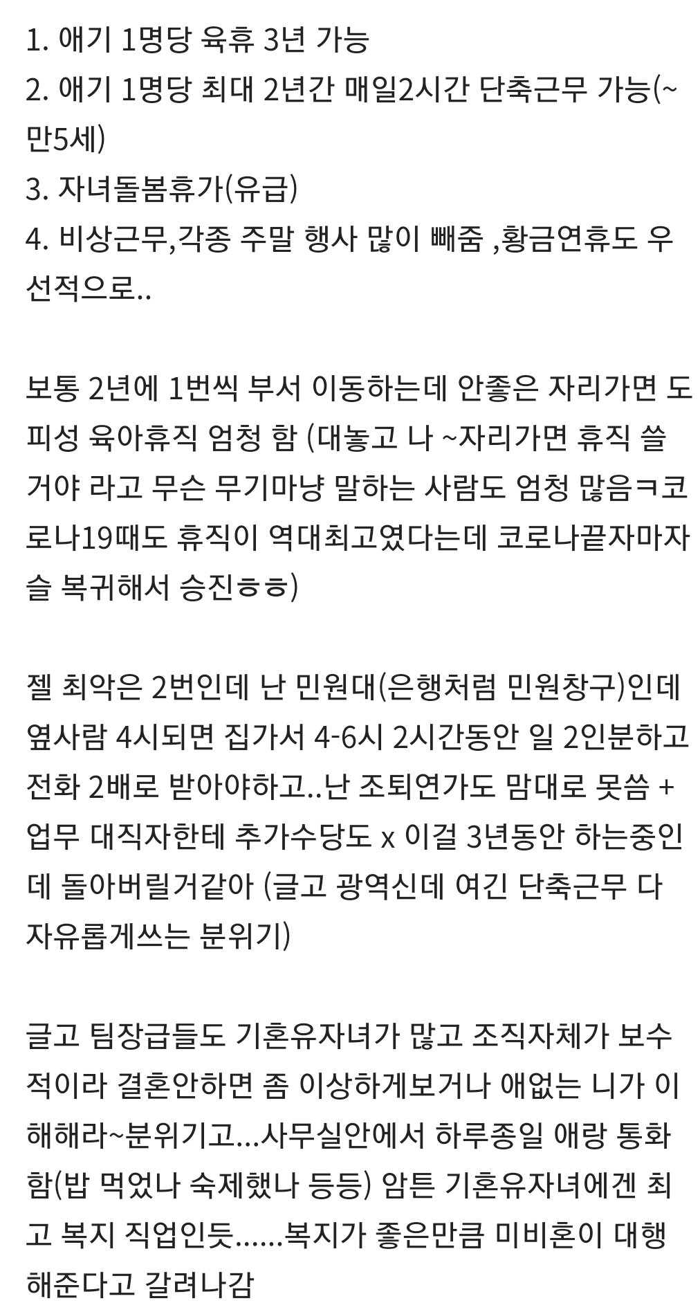 작성자5층입니다 작성시간 24.04.24 비혼이라 육아휴직자 업무까지 떠안고 죽어라 일하는데 휴직하고 복귀한 사람은 승진하고 나는 승진 밀리니 미쳐버림 ㅋㅋㅋ 휴직기간 일도 안하고 팀원들만 고통받는데 근속연수 인정하는거 개에바야.