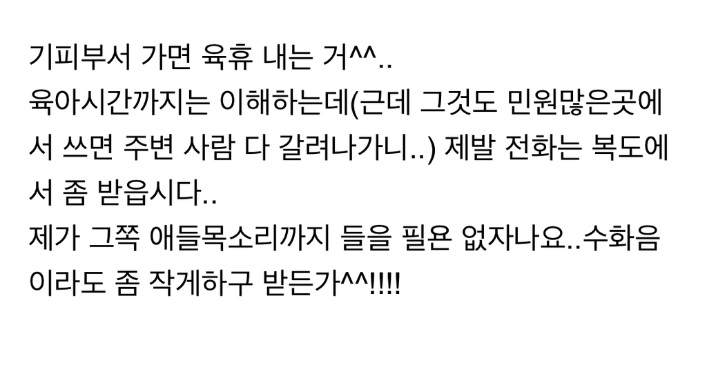 작성자안해이제 작성시간 24.04.23 진심 일하다가 옆에서 애랑 시시콜콜한 통화하는 거 듣기 싫음 급한 일도 아니고 백날천날 통화하는데 자기새끼 자기만 사랑스러움... 나가서 하든가 좀