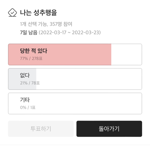 [스크랩] [흥미돋]한국 사회에서 성추행 경험 없는 여자 있을까 투표 달글 결과 작성자인생은고고싱|작성시간24.04.24|조회수2,997 목록 댓글 45 글자크기 작게가 글자크기 크게가 출처 : 여성시대 모래와 바다내가 달주니 허락 받았냐는 댓 ㄴㄴ10명 중에 7-8명이 당한 경험이 있는..대부분 고소도 못함 ㅠㅠ이래놓고 자식 낳으라 하지마 트라우마없는 게 다행이니까... 다음검색 스크랩 원문 : *여성시대* 차분한 20대들의 알흠다운 공간 현재 게시글 추가 기능 열기 북마크 공유하기 신고 센터로 신고 댓글 댓글 45 댓글쓰기 답글쓰기 댓글 리스트 작성자보리차 | 작성시간 24.04.24 없단 건 인지 못했을 가능성 큼뻥안치고 천번은 당했을듯 작성자여자들아 기죽지마라 | 작성시간 24.04.24 성추행 성희롱 다 겪어봄 작성자JeIly | 작성시간 24.04.24 안 겪어본 여자가 있을까 작성자여성의취업파트너 | 작성시간 24.04.24 없는 사람도 그냥 본인 생각에 괜찮은 정도라서 없다고 한 거 같애 왠지 없을 수가 없음 작성자강사장사랑해 | 작성시간 24.04.24 다 겪어봤지 댓글 전체보기