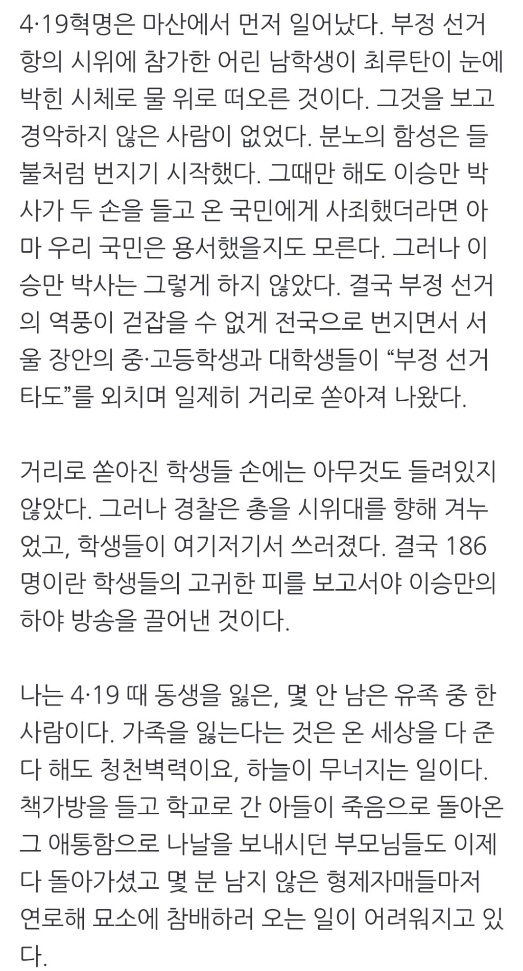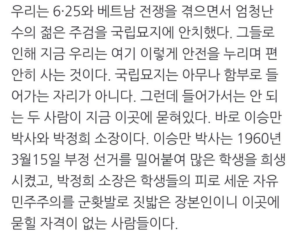 [스크랩] [여시뉴스데스크]이승만·박정희를 국립묘지에서 파묘하라 [왜냐면] 작성자천리길|작성시간24.04.25|조회수1,166 목록 댓글 4 글자크기 작게가 글자크기 크게가 출처: https://naver.me/5yBTw7ec이승만·박정희를 국립묘지에서 파묘하라 [왜냐면]최문정 | 4·19혁명 희생자 유족 우리는 6·25와 베트남 전쟁을 겪으면서 엄청난 수의 젊은 주검을 국립묘지에 안치했다. 그들로 인해 지금 우리는 여기 이렇게 안전을 누리며 편안히 사는 것이다. n.news.naver.com이하 생략전문 출처로 다음검색 스크랩 원문 : *여성시대* 차분한 20대들의 알흠다운 공간 현재 게시글 추가 기능 열기 북마크 공유하기 신고 센터로 신고 댓글 댓글 4 댓글쓰기 답글쓰기 댓글 리스트 작성자이초 | 작성시간 24.04.25 파묘하라!!! 작성자갈증엔그라목손 | 작성시간 24.04.25 파묘요!! 작성자떨떨이 | 작성시간 24.04.25 린정 작성자맛고을식품1 | 작성시간 24.04.25 파묘요! 댓글 전체보기
