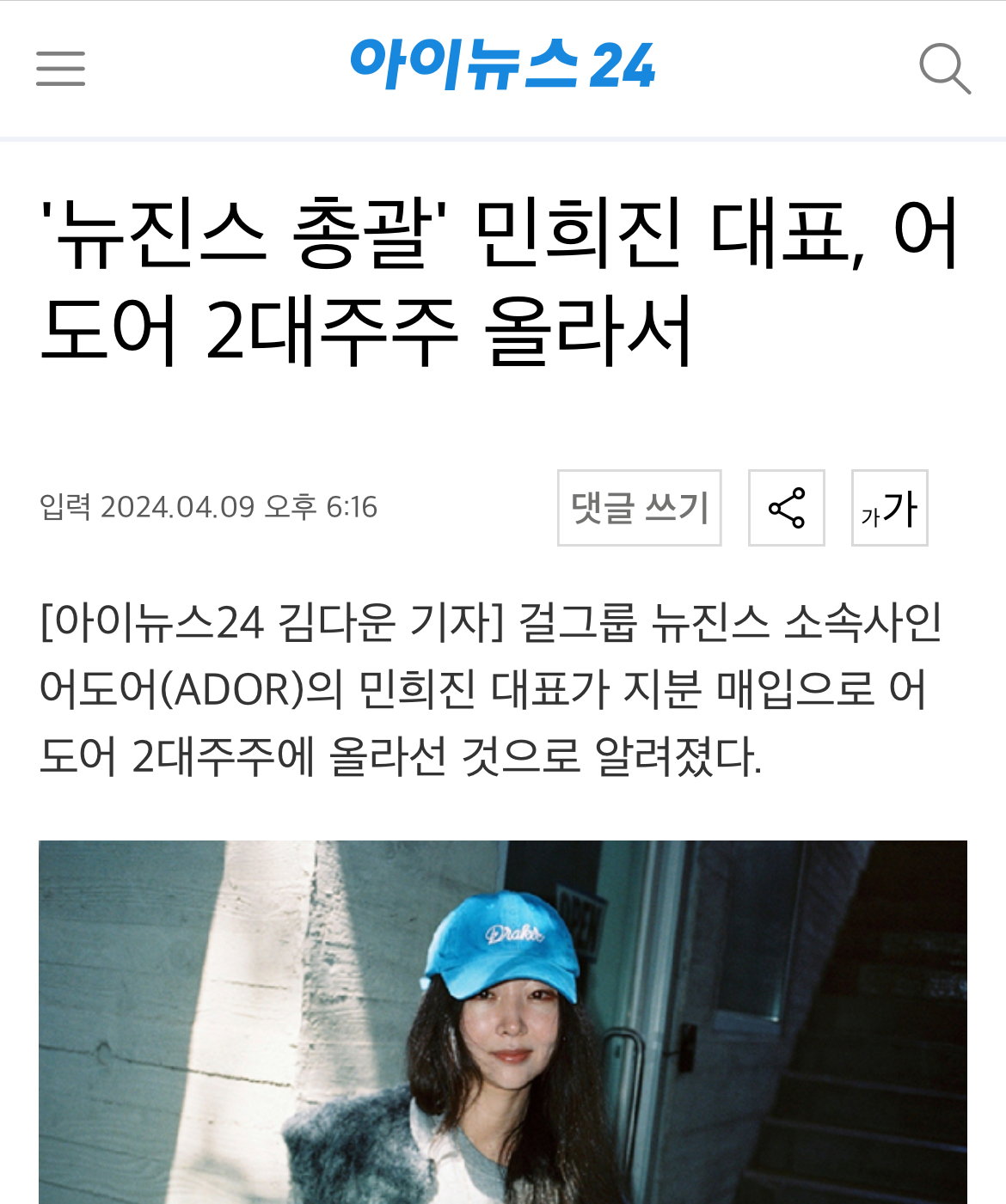 뉴진스 소속 어도어 대표 민희진 배임 혐의 기사>
