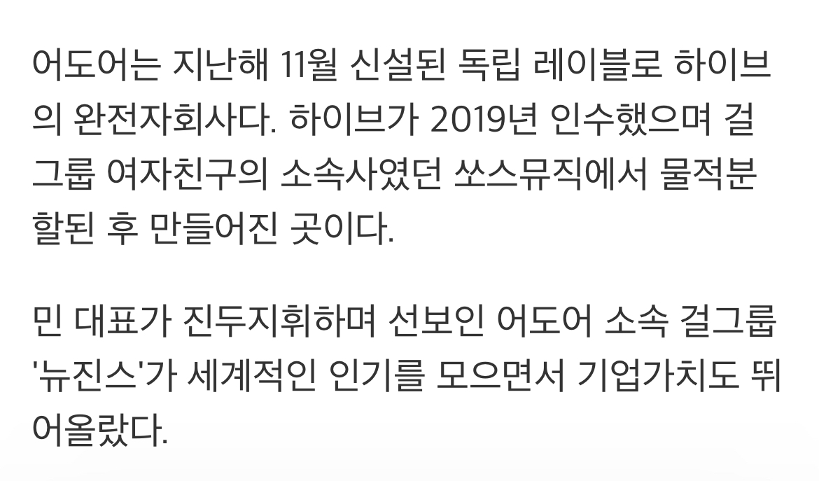 하이브 첫 걸그룹으로 내겠다고 뉴진스 부모님에게 약속한 민희진▶️ 하이브, 첫 걸그룹으로 뉴진스 말고 다른 그룹 내겠음 "통보" ▶️ 민희진 울며 겨자먹기로 뉴진스 데뷔를 위해 하이브 레이블 어도어 설립