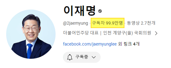이재명 더불어민주당 대표가 유튜브 방송을 마무리할 때면 하는 영상 마무리 멘트다. 영상에서 ‘좋아요’와 구독을 요청하던 이재명 대표의 개인 유튜브 채널이 100만 구독자 달성을 눈앞에 두고 있다.