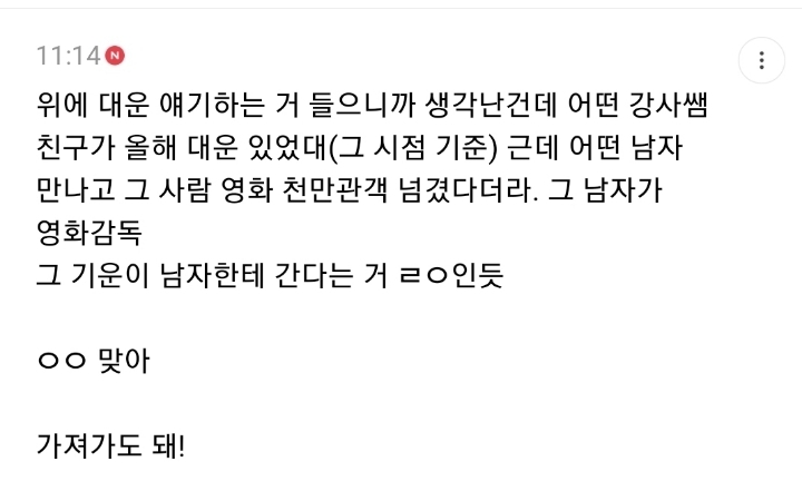 작성자그데 작성시간 24.04.29 나 이거 진짜로 믿는게 남자 만날 당시에 내 대운 바뀌었거든? 근데 상대남 내 대운 바뀐 년도에 시험 합격함; 관운 걔가 뺏어간거같아서 가끔씩 혈압 올라ㅡㅡ