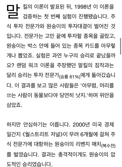 덧붙이는 근거로 전문가들과 원숭이가 눈을가리고 다트를 던져서 찍은 주식과 비교했을때 원숭이가 이겼다는 실험입니다.