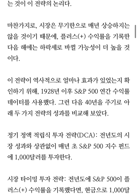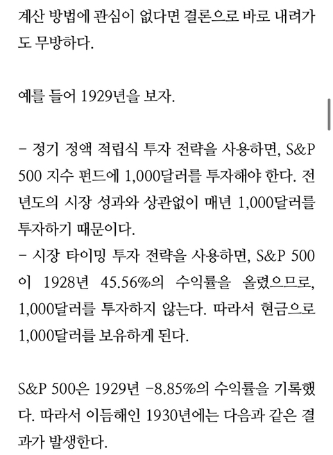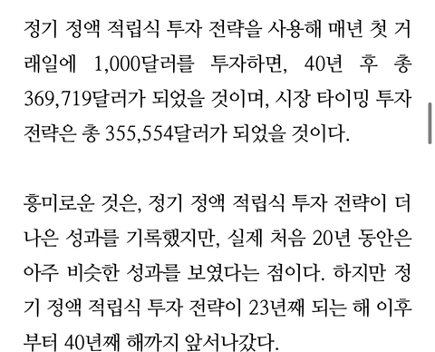 이렇듯 마켓타이밍을 고려하지 않은 적립식 기계적 투자와 마켓타이밍이 딱히 결과가 다르지않고 오히려 앞설수도 있습니다