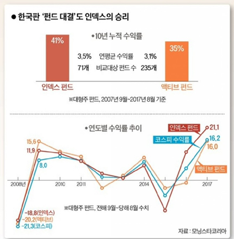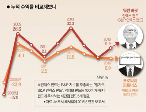 시장지수만 추종하는 인덱스펀드가 적극적인 종목선택을 하는 헤지펀드(액티브펀드)에비해 압승을 거두었습니다.