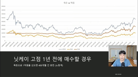 재수가 개 없다는 일본의 닛케이지수 인덱스에 고점 1년전에 한번에 투자했을때와 적립식 투자를했을때의 백테스팅 결과값입니다