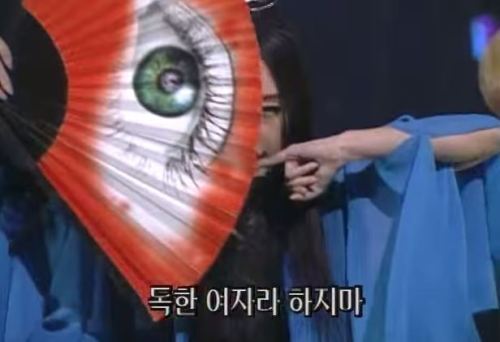 강력한 눈화장에 손가락 마이크, 왕비녀에 빨간 눈모양 부채까지
