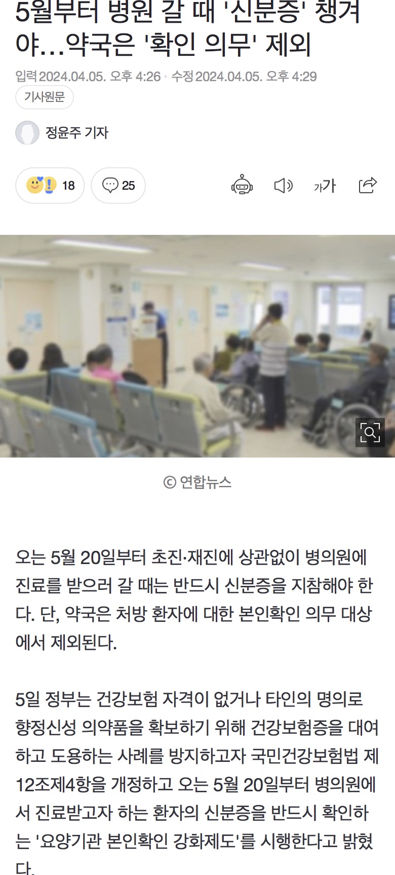 [여시뉴스데스크]5월부터 병원 갈 때 '신분증' 챙겨야…약국은 '확인 의무' 제외 작성자슈펄사이|작성시간24.05.01|조회수2,979 목록 댓글 29 글자크기 작게가 글자크기 크게가 출처: https://naver.me/xUFVVGOq5월부터 병원 갈 때 '신분증' 챙겨야…약국은 '확인 의무' 제외오는 5월 20일부터 초진·재진에 상관없이 병의원에 진료를 받으러 갈 때는 반드시 신분증을 지참해야 한다. 단, 약국은 처방 환자에 대한 본인확인 의무 대상에서 제외된다. 5일 정부는 건강보험n.news.naver.com전문 출처 다음검색 현재 게시글 추가 기능 열기 북마크 공유하기 신고 센터로 신고 댓글 댓글 29 댓글쓰기 답글쓰기 댓글 리스트 작성자비냉에식초팍팍 | 작성시간 24.05.01 최근에 지인이 예전에알바하던 곳 사장이 도용해서 병원다녔다고 해서 난리난적있었음.. ㅠ 확인하는게맞는거같아 작성자JHBB | 작성시간 24.05.01 하 접수할때 졸라 스트레스 받을듯ㅋㅋㅋㅋㅋㅋㅋㅋㅋㅋ 작성자dick me 웃기네 | 작성시간 24.05.01 해야되 작성자명작끌올하는여시 | 작성시간 24.05.02 초진만하는거였어? 재진도하지 답댓글 작성자바람을타고날아 | 작성시간 24.05.04 이제 재진도한다는거~ 댓글 전체보기