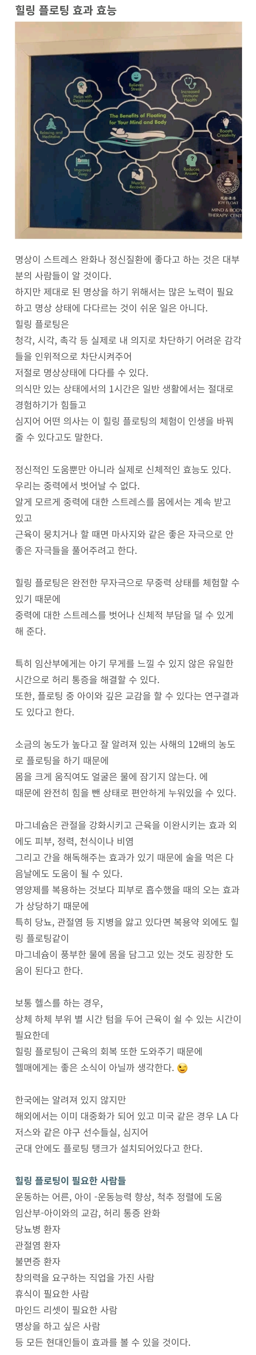 [스크랩] [흥미돋]감각차단탱크 (힐링플로팅) 작성자etaeta|작성시간24.05.01|조회수9,021 목록 댓글 29 글자크기 작게가 글자크기 크게가 출처 : 여성시대 http://naver.me/FJHSq9tY[감각차단 물탱크-힐링 플로팅] 물 위에서 무중력으로 진정한 휴식을힐링플로팅이란 Healing floating 출처:티타임즈 힐링 플로팅 효과 효능 명상이 스트레스 완화나 정신질환에 좋다고 하는 것은 대부분의 사람들이 알 것이다. 하지만 제대로 된 명상을 하기 위해서kbbvely.tistory.com 스띵 보다가 급 궁금해 찾아본 감각차단탱크 한국에는 하는곳이 별로 없는듯 아니 딱 한곳있다네.. 다음검색 스크랩 원문 : *여성시대* 차분한 20대들의 알흠다운 공간 현재 게시글 추가 기능 열기 북마크 공유하기 신고 센터로 신고 댓글 댓글 29 댓글쓰기 답글쓰기 댓글 리스트 작성자denymeandbedoomed | 작성시간 24.05.01 난 이거 스쿠버할때느낌ㅋㅋㅋ 작성자재갈량 | 작성시간 24.05.01 이거 볼때마다 소금물이라도 귀에 물 안들어가는지 궁금 사진보면 그래도 귀는 잠긴거같은데... 작성자나는 행복한 우주먼지야 | 작성시간 24.05.01 오 기묘한 이야기 작성자양배추당근수프 | 작성시간 24.05.01 빅뱅이론에 나왓던 거다 작성자억압게시핀 | 작성시간 24.05.02 개무서워..! 댓글 전체보기