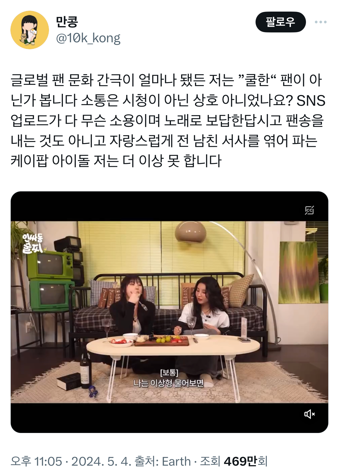 글로벌 팬 문화 간극이 얼마나 됐든 저는 ”쿨한“ 팬이 아닌가 봅니다 소통은 시청이 아닌 상호 아니었나요? SNS 업로드가 다 무슨 소용이며 노래로 보답한답시고 팬송을 내는 것도 아니고 자랑스럽게 전 남친 서사를 엮어 파는 케이팝 아이돌 저는 더 이상 못 합니다 pic.twitter.com/88xhxTxFJd
