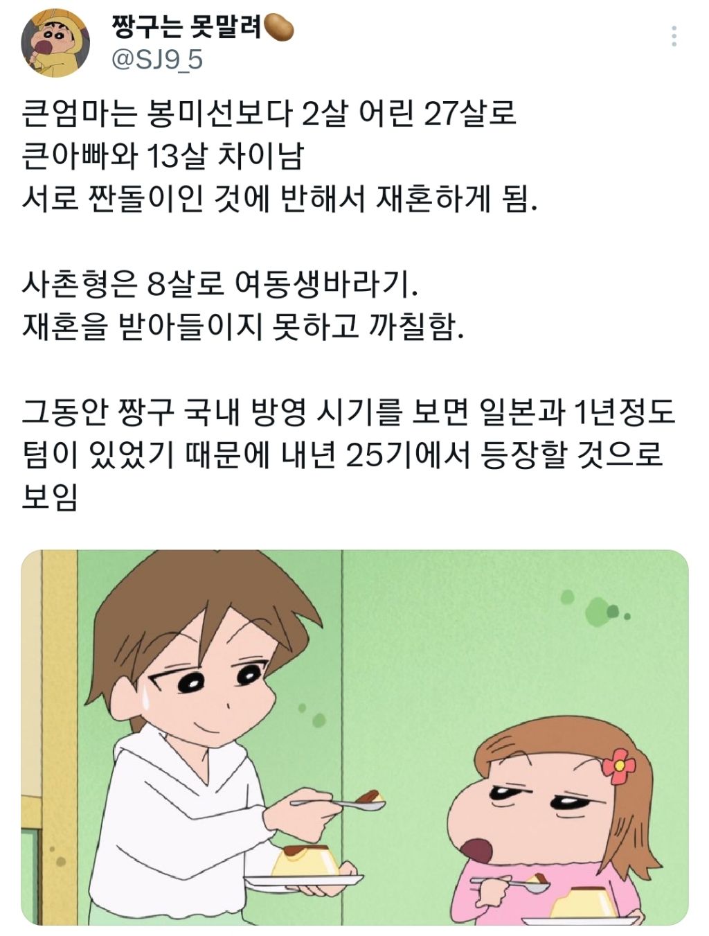 [스크랩] [흥미돋]현시각 X트렌딩 중인 짱구 사촌형 작성자how sweet|작성시간24.05.06|조회수12,161 목록 댓글 39 글자크기 작게가 글자크기 크게가 출처: 여성시대 울강쥐건강하길수요상이래"형만이네 형이 재혼한 와이프의 아이" 래!!!신형만 피 안섞임@ 짱구 사촌형 약간 괴롭히고싶게 생김@짱구 사촌형이 신형만쪽이었음 반대인줄 알았는데!!!@ 딱봐도 수요많아보임@짱구가 사촌형을 진짜 좋아하네+한국에서 시즌25로 내년에 방영할것같대 다음검색 스크랩 원문 : *여성시대* 차분한 20대들의 알흠다운 공간 현재 게시글 추가 기능 열기 북마크 공유하기 신고 센터로 신고 댓글 댓글 39 댓글쓰기 답글쓰기 댓글 리스트 답댓글 작성자신림90 | 작성시간 24.05.06 19살에 낳은것같아ㅋㅋㅋ19살에 낳아서 지금 27세 작성자클로드모네 | 작성시간 24.05.06 재혼을 받아들이지 못한다는거보니까신형만 형의 아들일 뿐인듯 작성자상태가메롱 | 작성시간 24.05.06 철수가 질투할듯 ㅋㅋㅋㅋㅋㅋㅋㅋ그런 에피 만들어줘 작성자치킨튀김내놔 | 작성시간 24.05.06 와 예쁘게 생김 작성자얼렁뚱땡입니다 | 작성시간 24.05.06 사촌동생은 걍 짱구네 ㅋㅋㅋㅋㅋㅋㅋㅋㅋ 댓글 전체보기