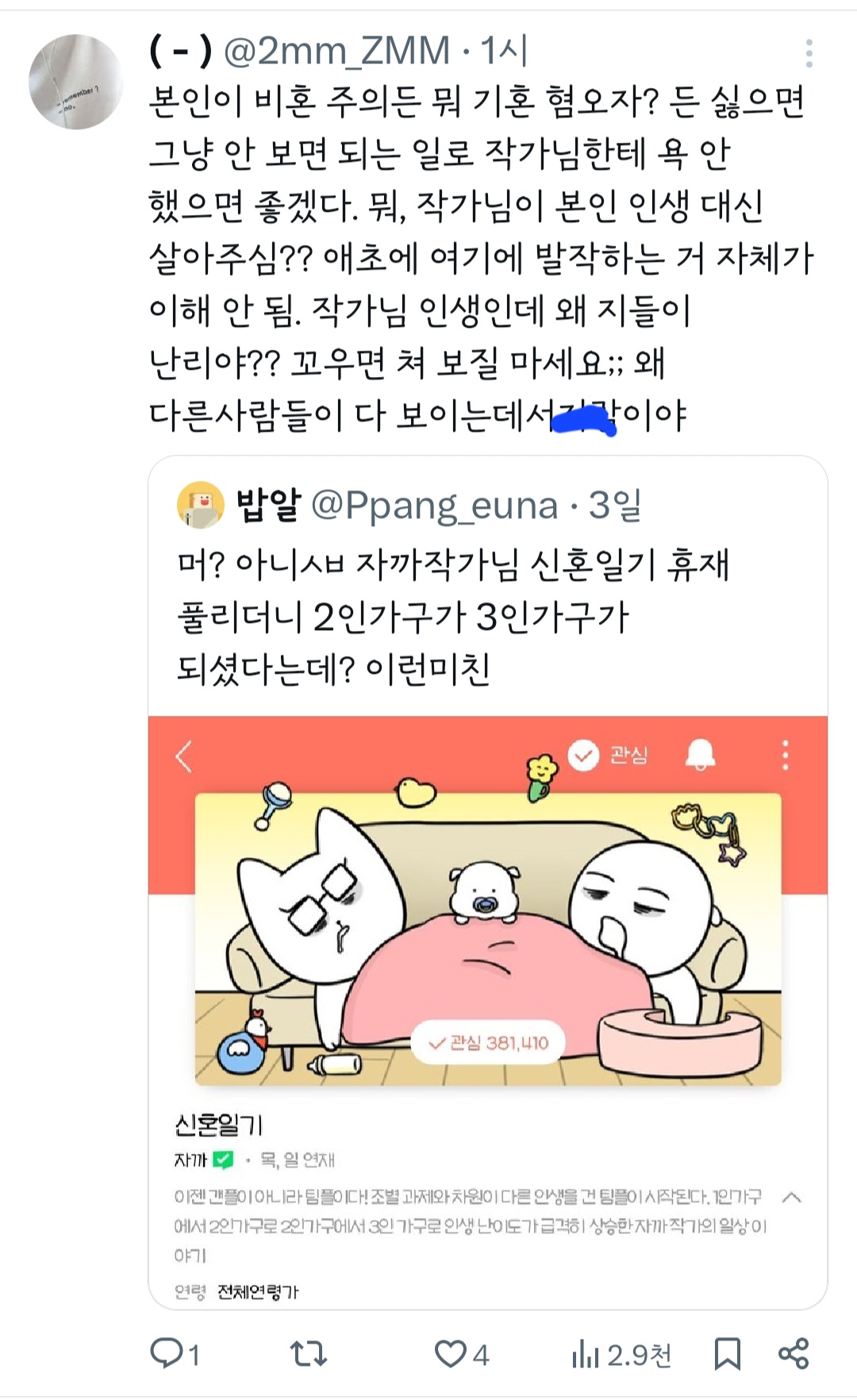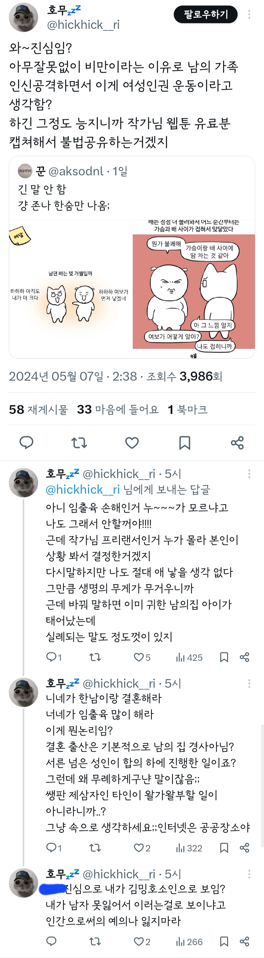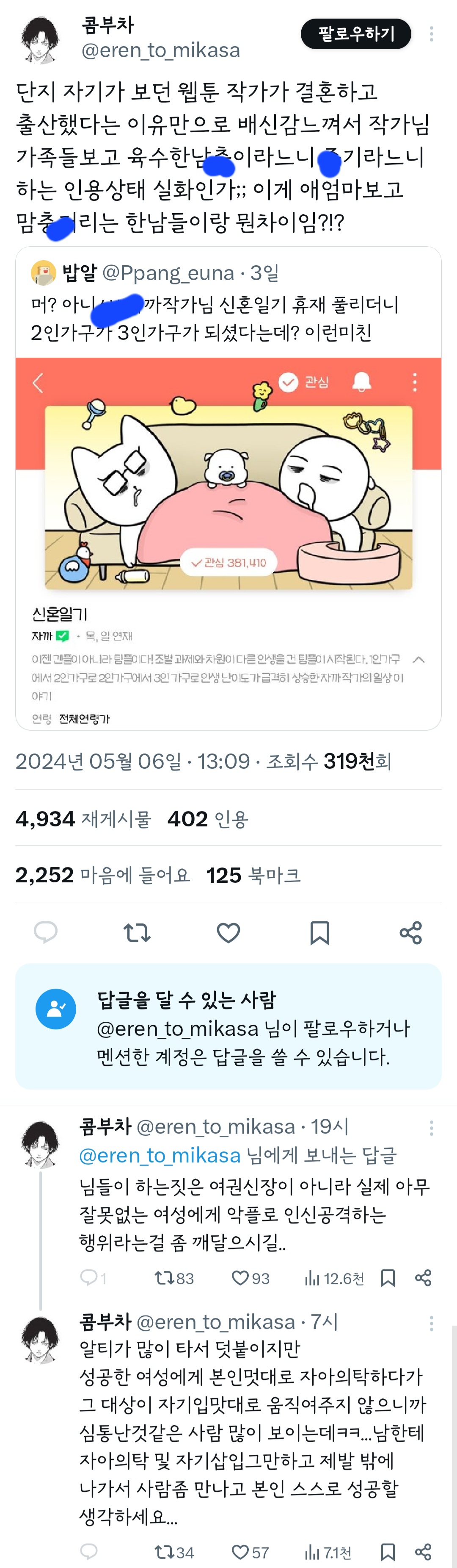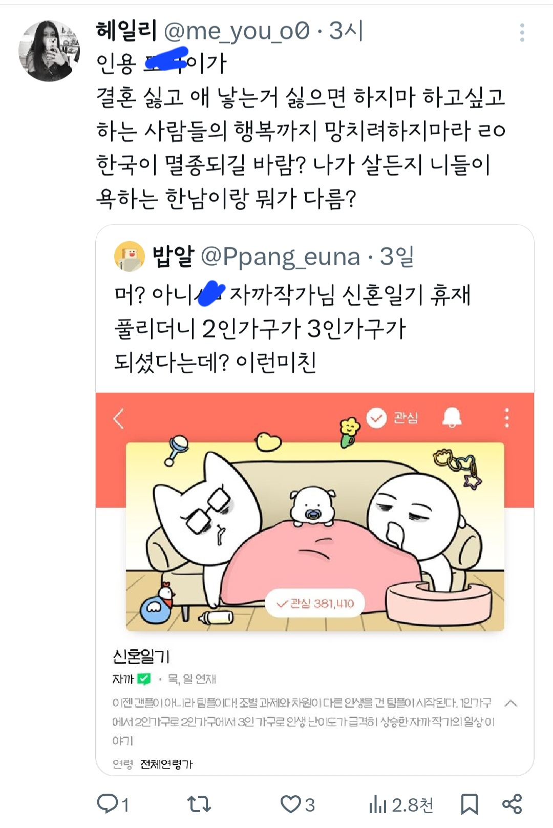 인기웹툰'여자'작가는 꼭 페미감성에 비혼이어야 되는거야? 그래야 욕을 안 먹나? 무슨 기준으로 욕하는 건지 모르겠다 ㅜ 작가님 싹다 고소하시길
