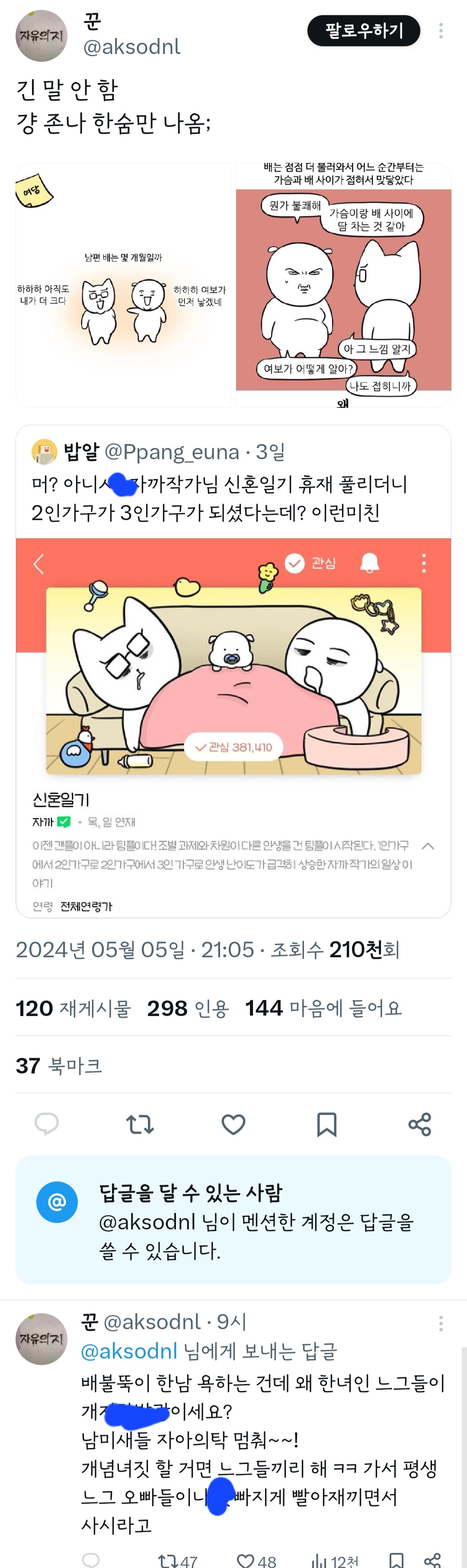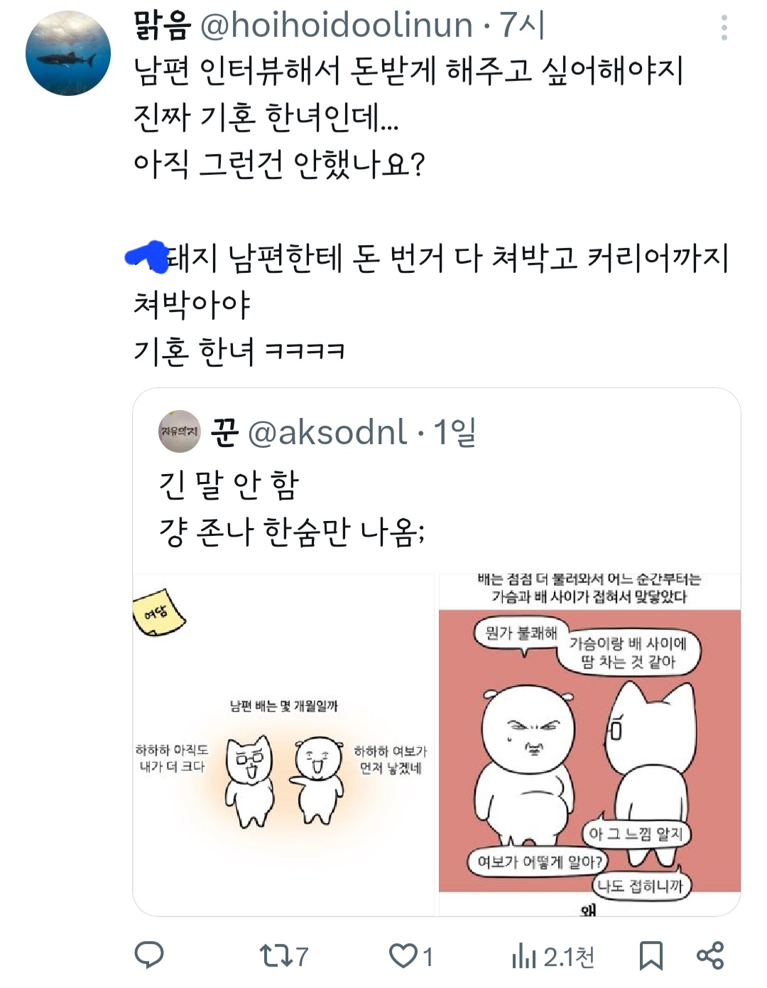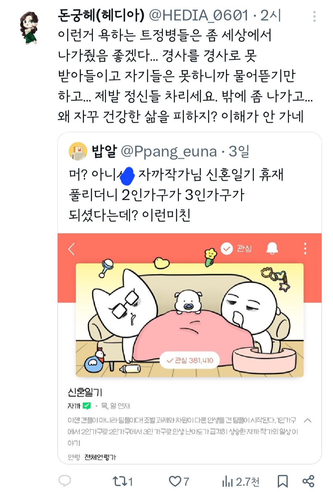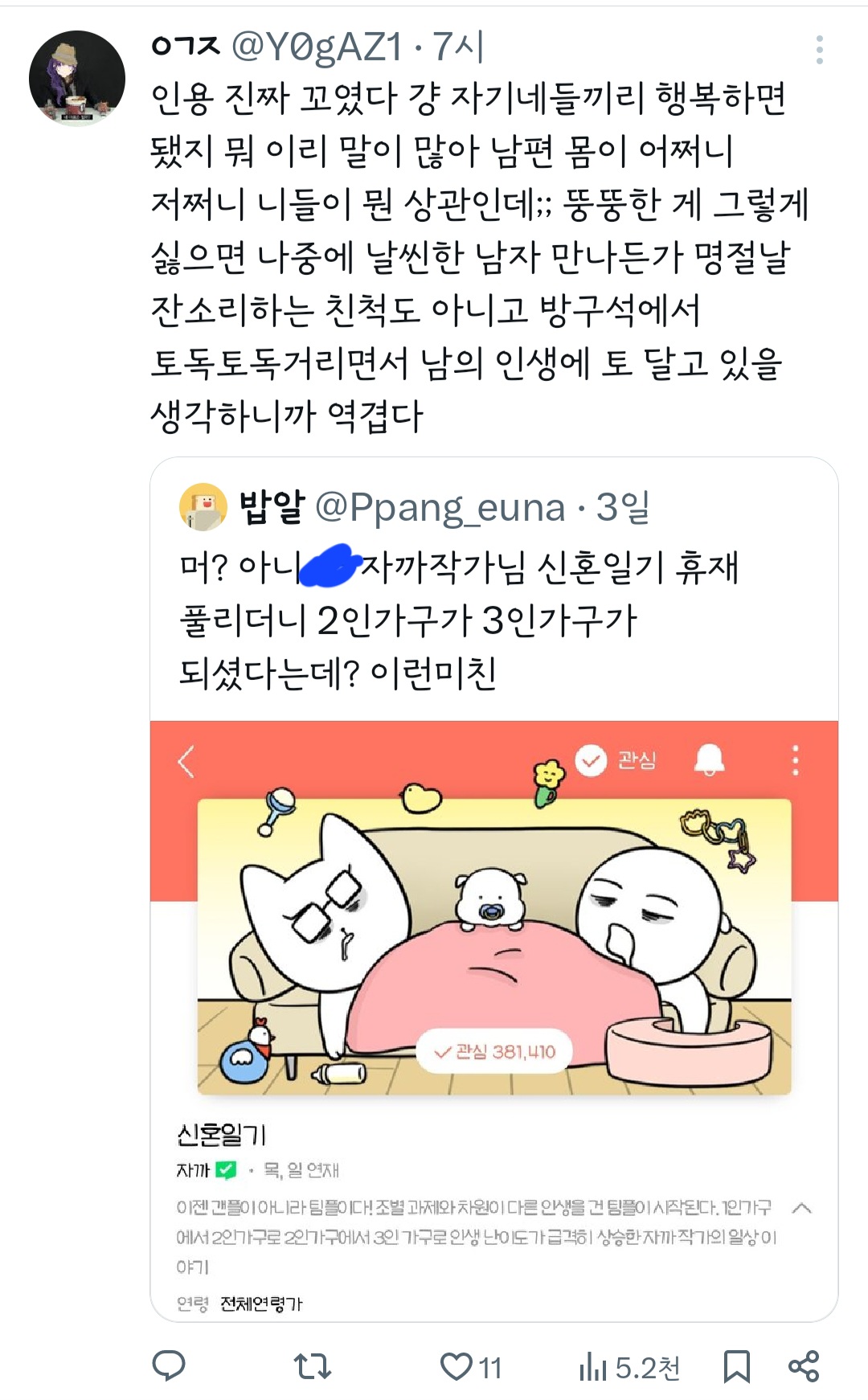 인기웹툰'여자'작가는 꼭 페미감성에 비혼이어야 되는거야? 그래야 욕을 안 먹나? 무슨 기준으로 욕하는 건지 모르겠다 ㅜ 작가님 싹다 고소하시길