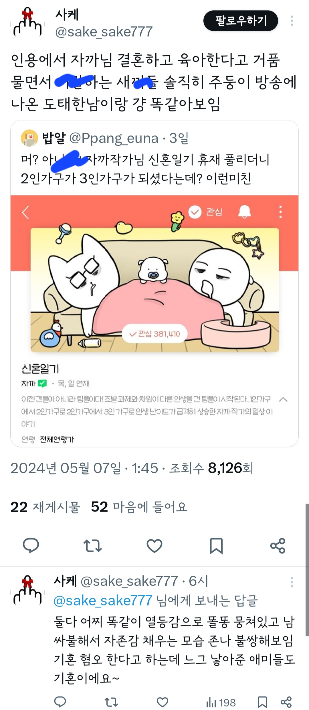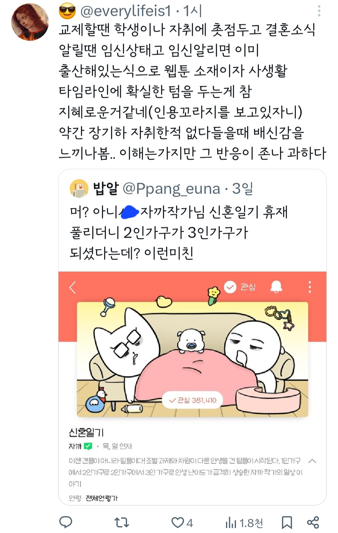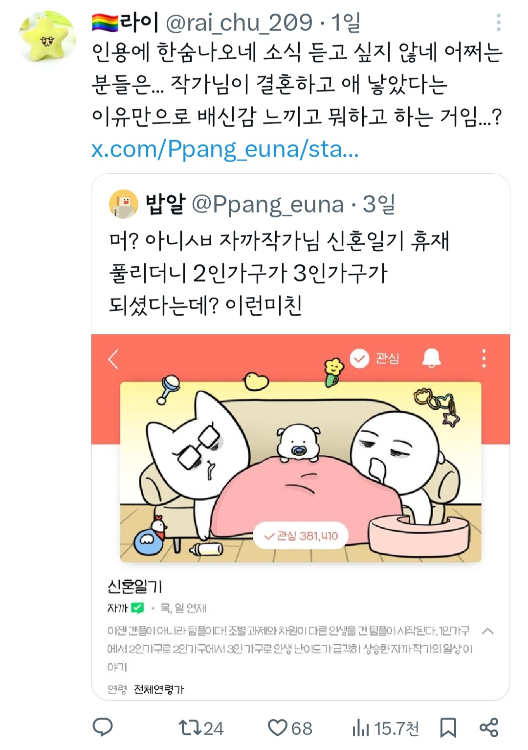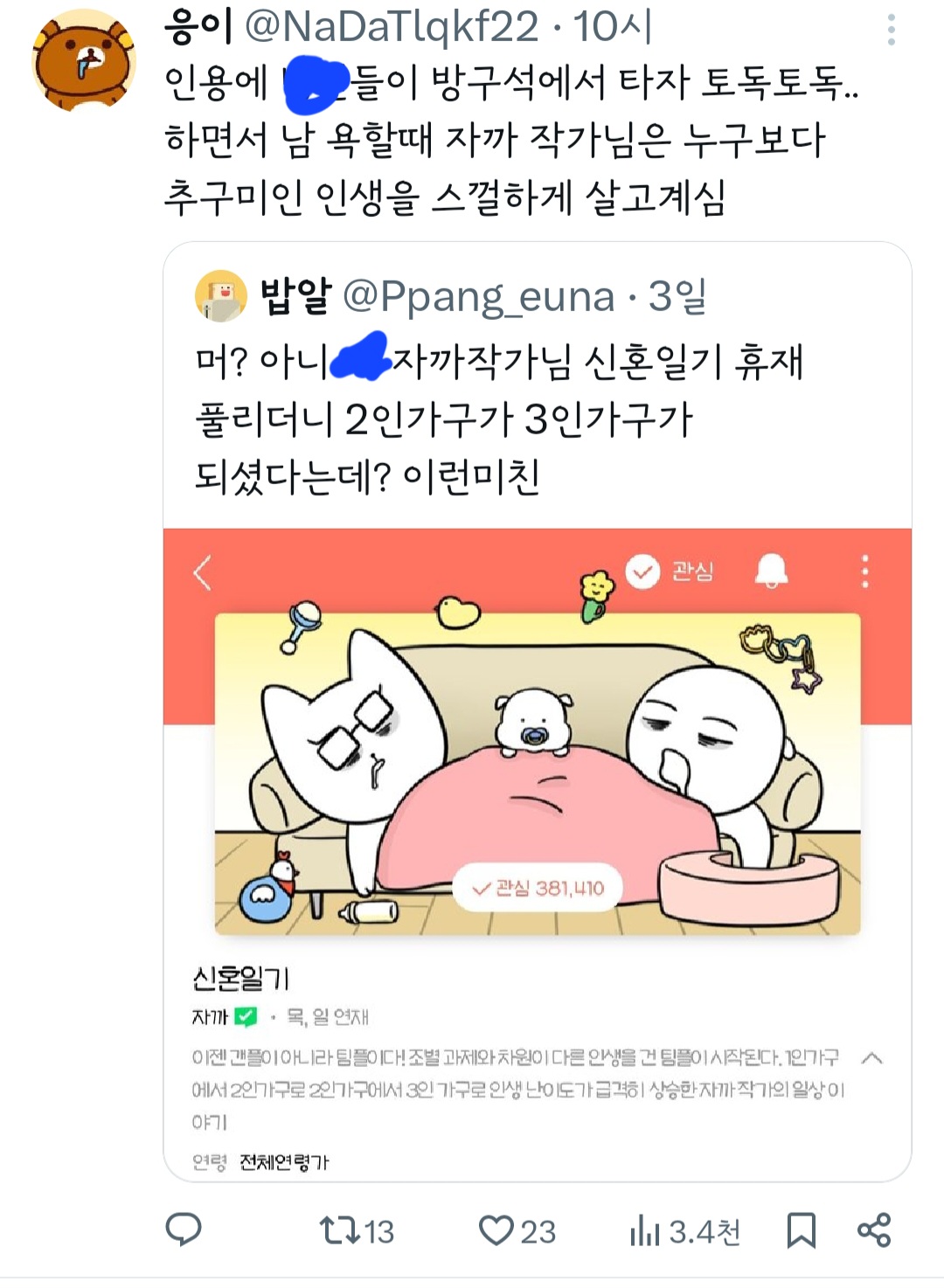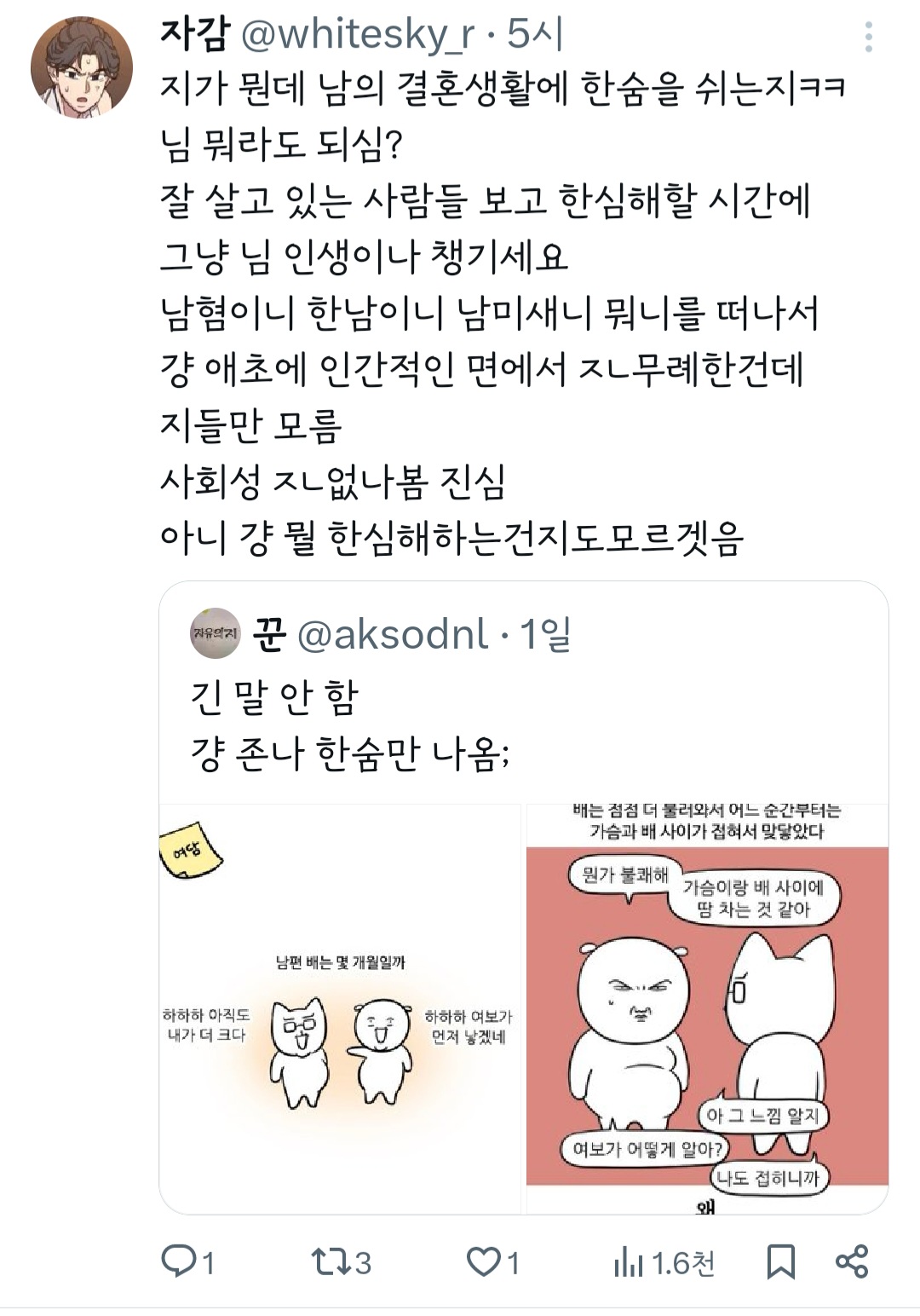 인기웹툰'여자'작가는 꼭 페미감성에 비혼이어야 되는거야? 그래야 욕을 안 먹나? 무슨 기준으로 욕하는 건지 모르겠다 ㅜ 작가님 싹다 고소하시길