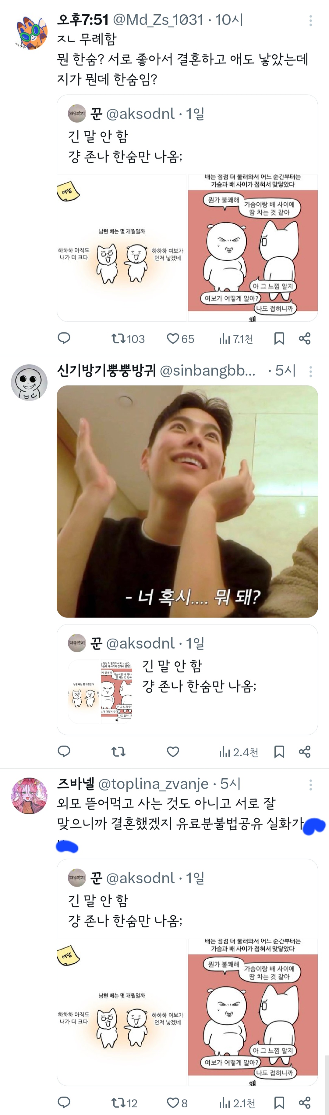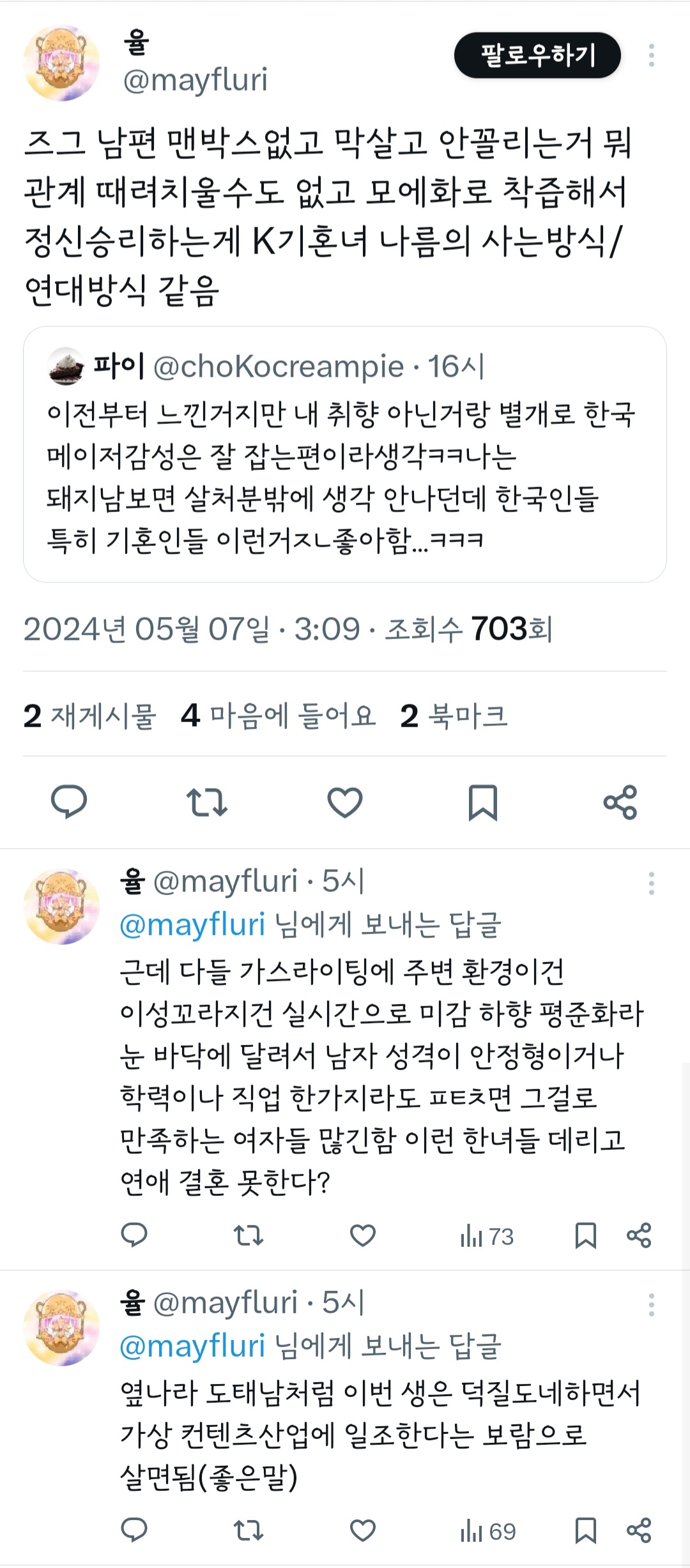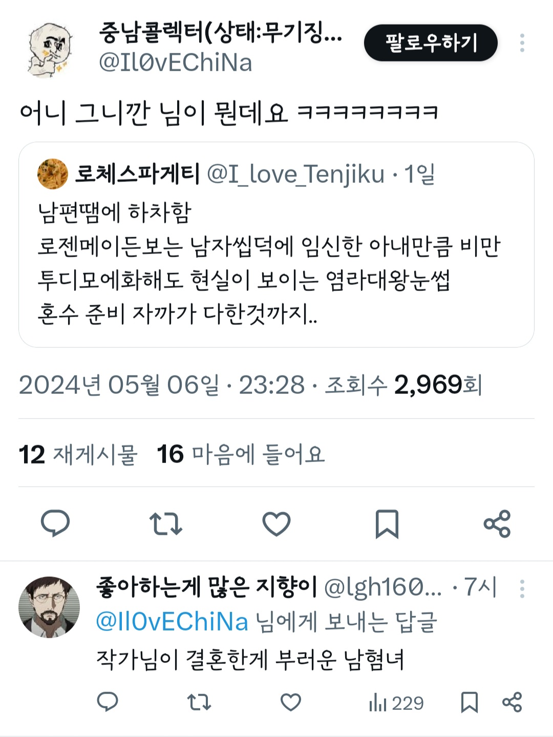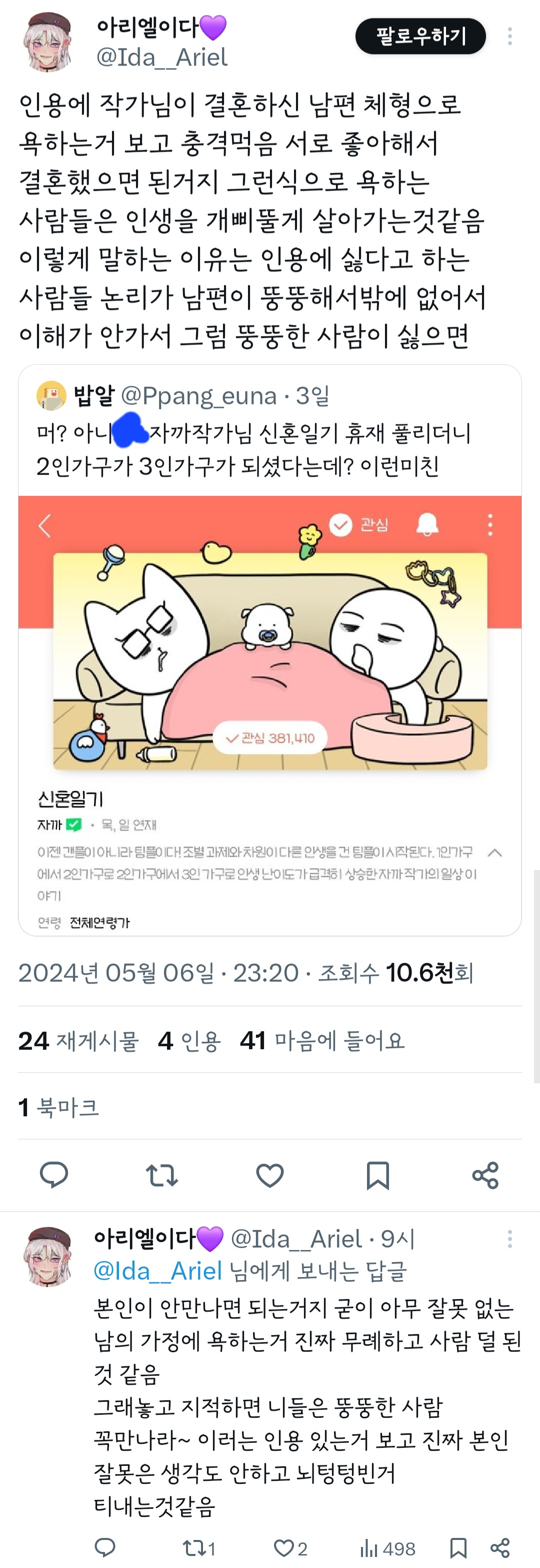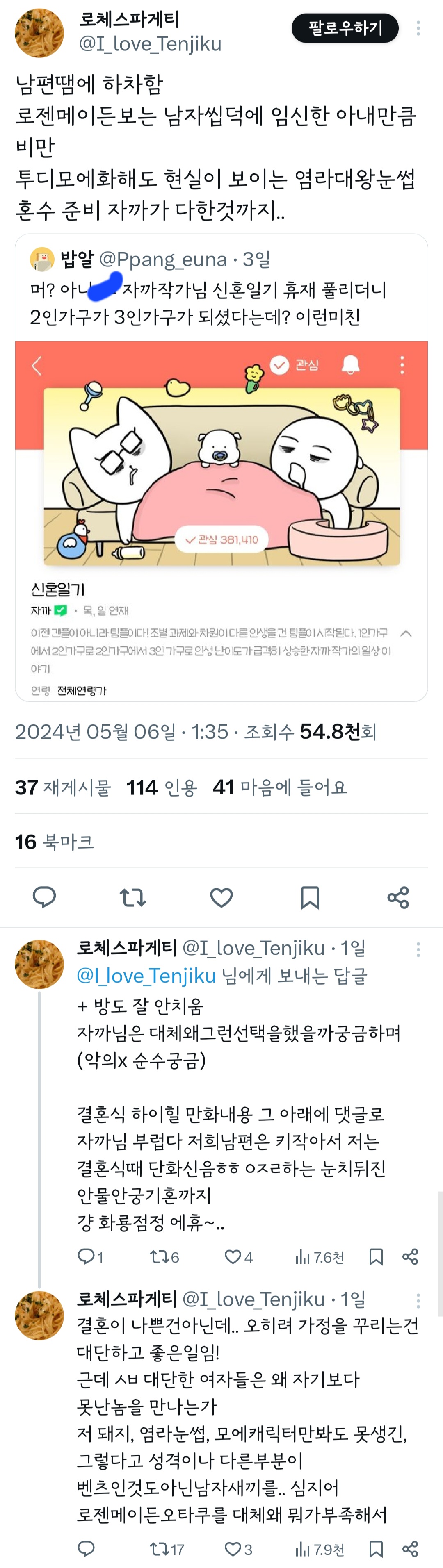 작성자띠용핑 작성시간 24.05.09 그냥 행복하신가보다~신기하다 하고 넘겼는데 저걸 굳이 욕하는 건 뭐지 결이 안맞으면 안보면 되는걸 ㅠ