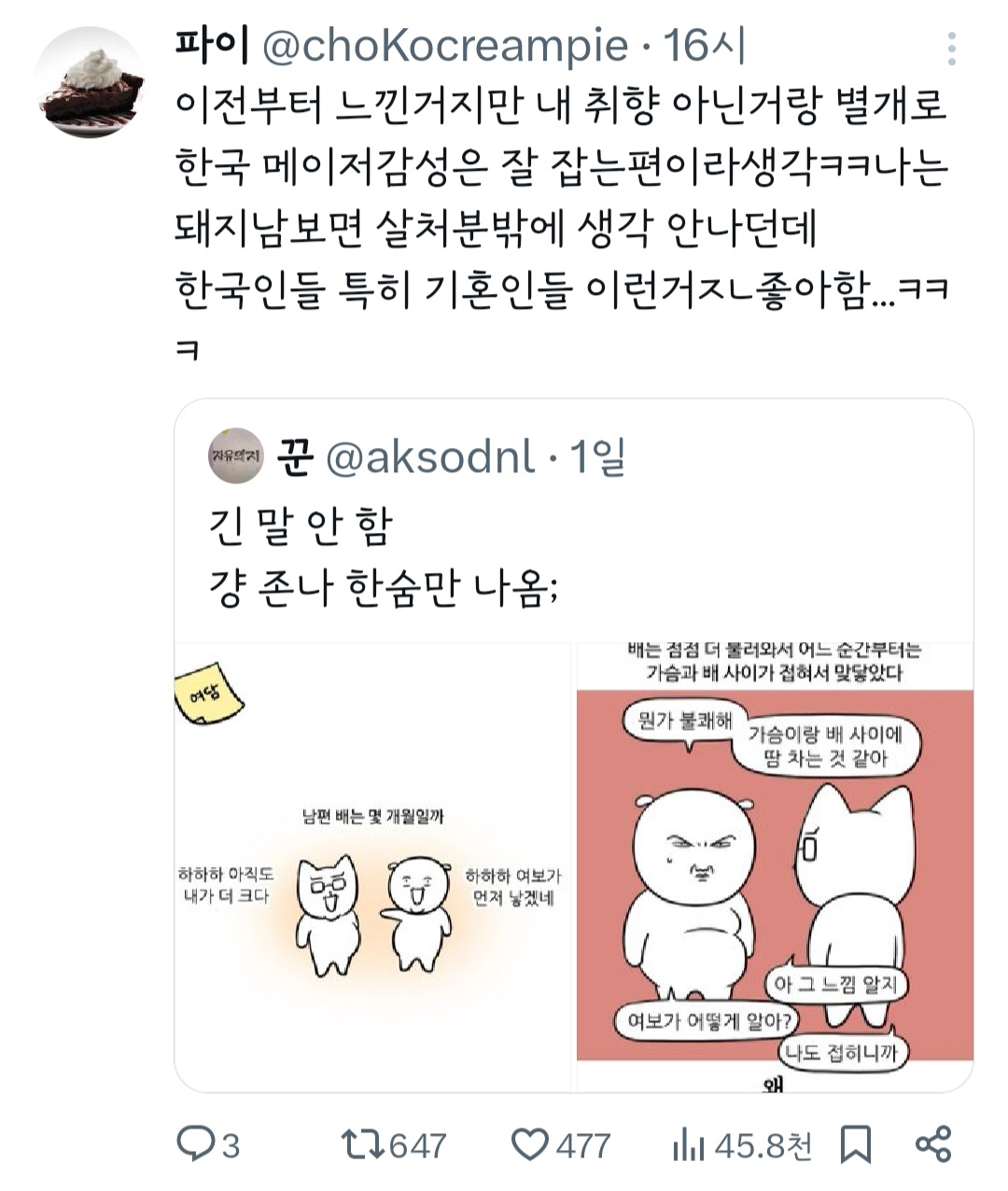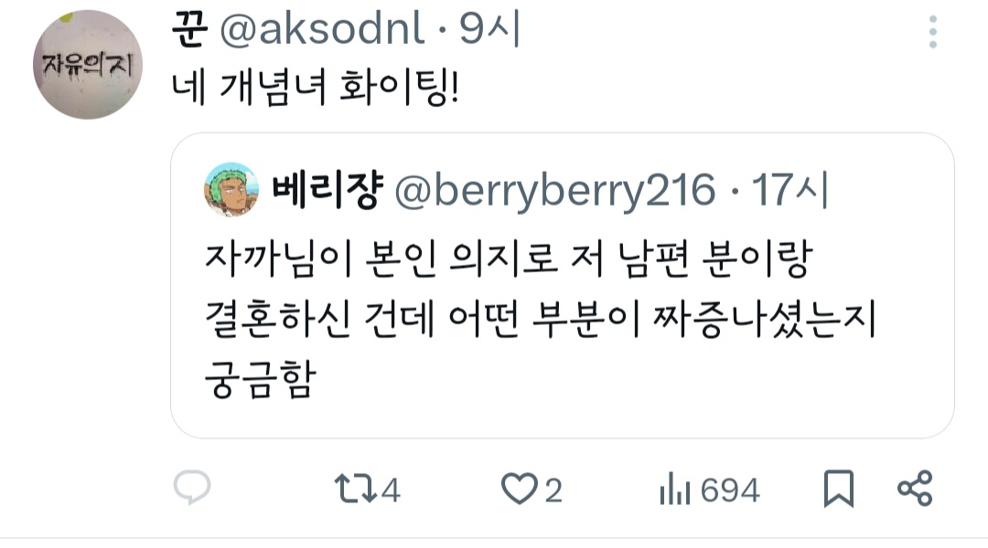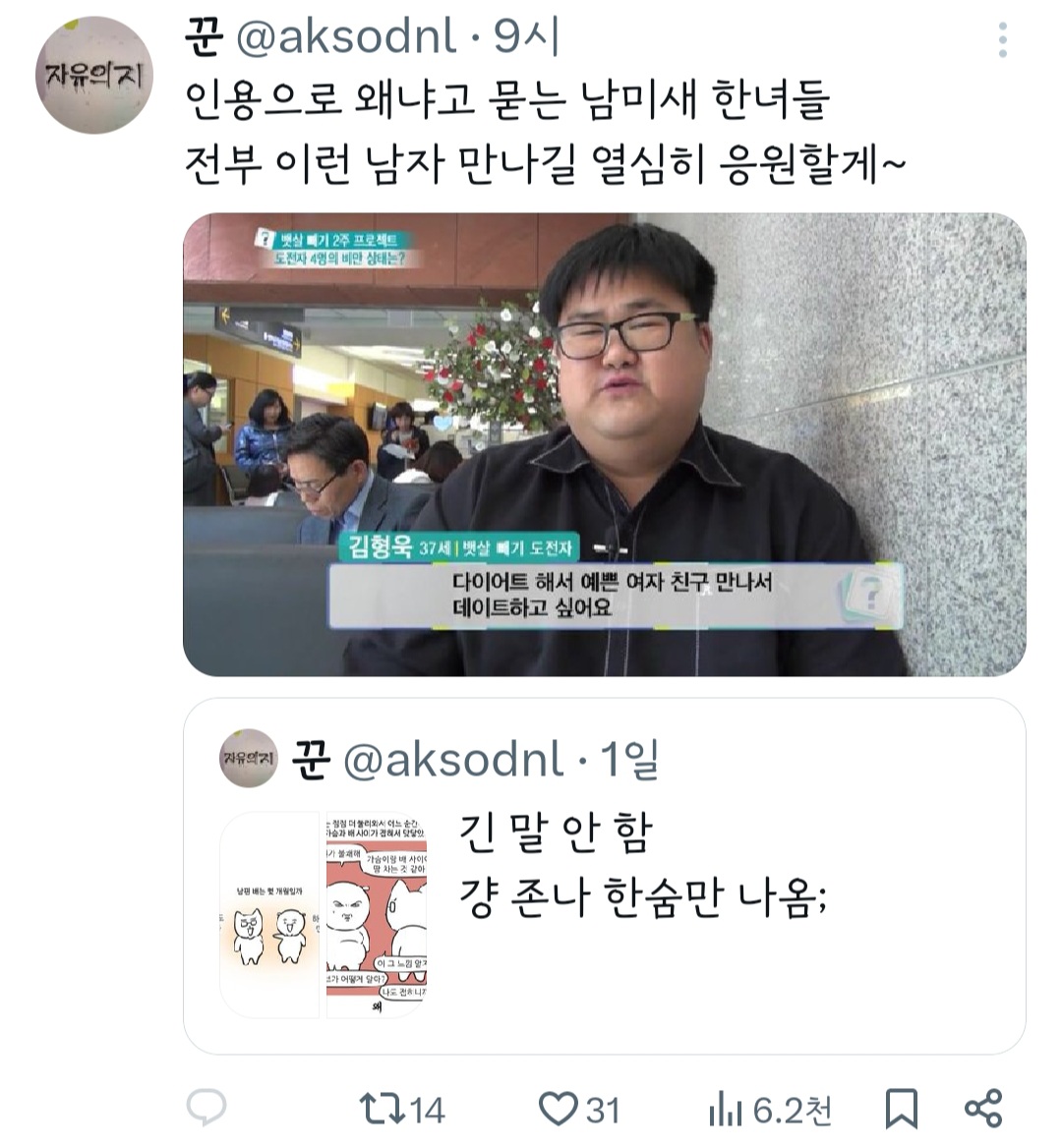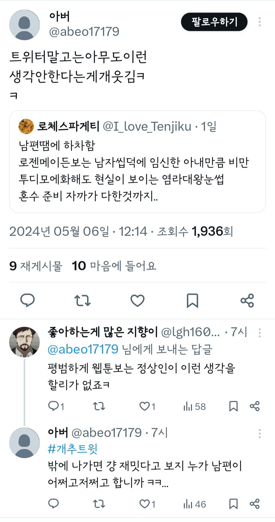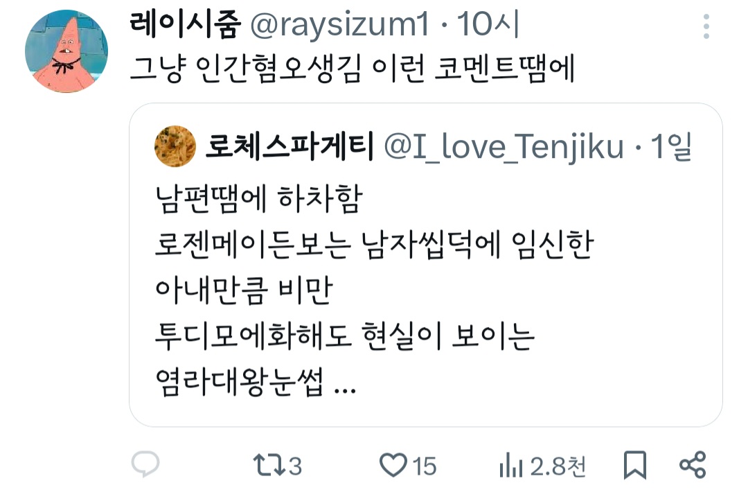 작성자띠용핑 작성시간 24.05.09 그냥 행복하신가보다~신기하다 하고 넘겼는데 저걸 굳이 욕하는 건 뭐지 결이 안맞으면 안보면 되는걸 ㅠ